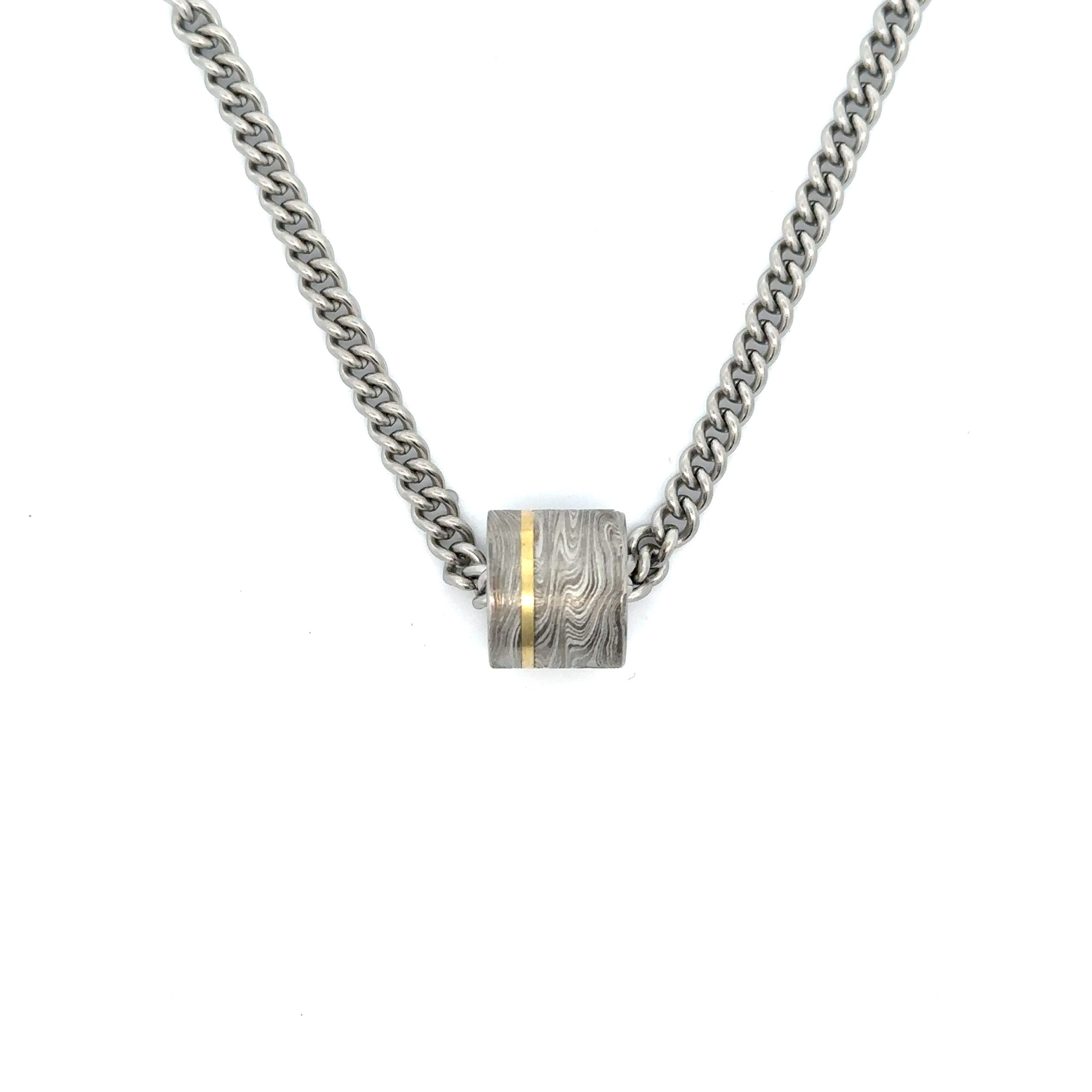 11X12MM DAMASCUS SS BEAD W/ 18KY INLAY. 24″ SS CURB CHAIN.