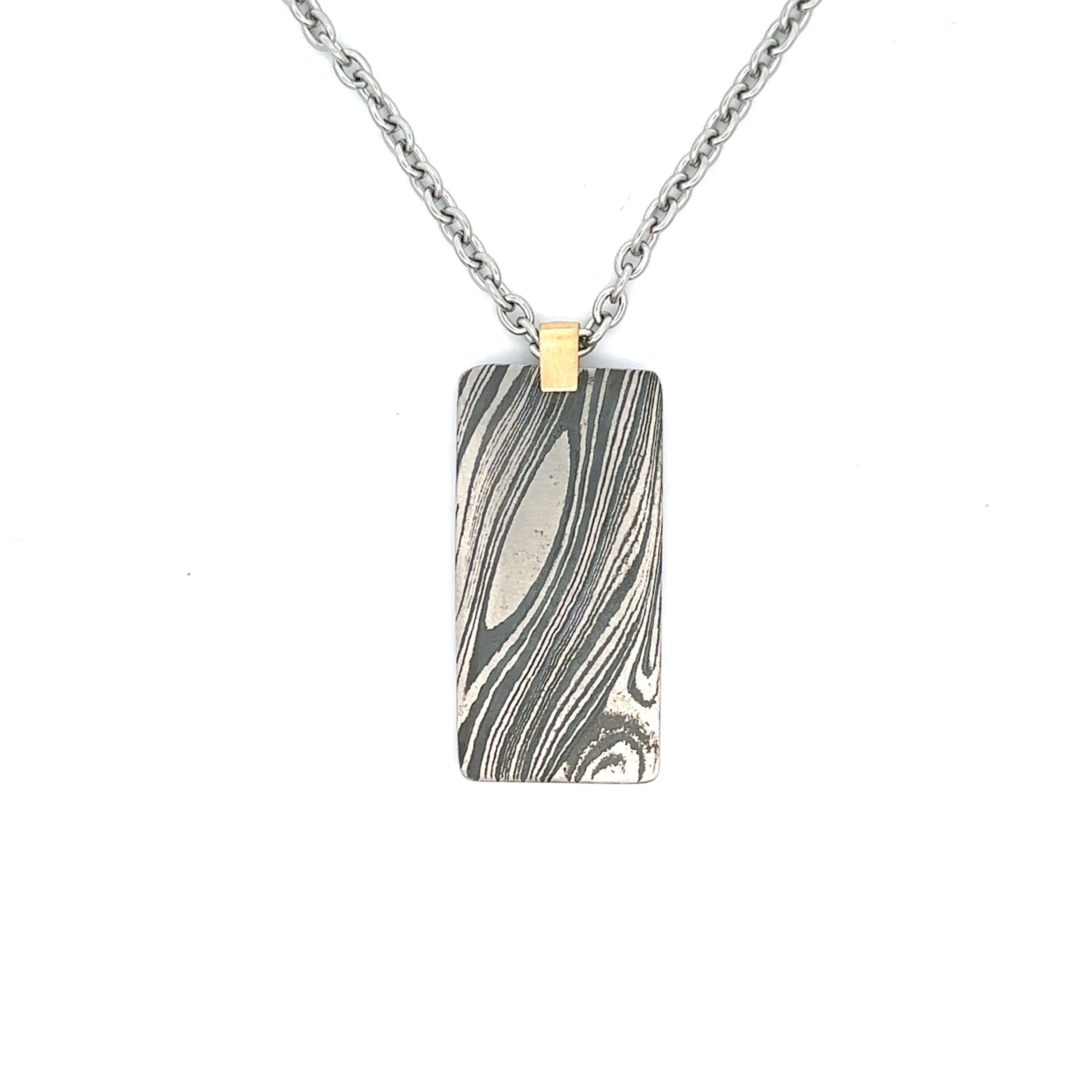 20X40MM DAMASCUS SS DOGTAG (W/ BLACK OXIDE FINISH) W/ 18KY BAIL. 30″ SS CABLE CHAIN.