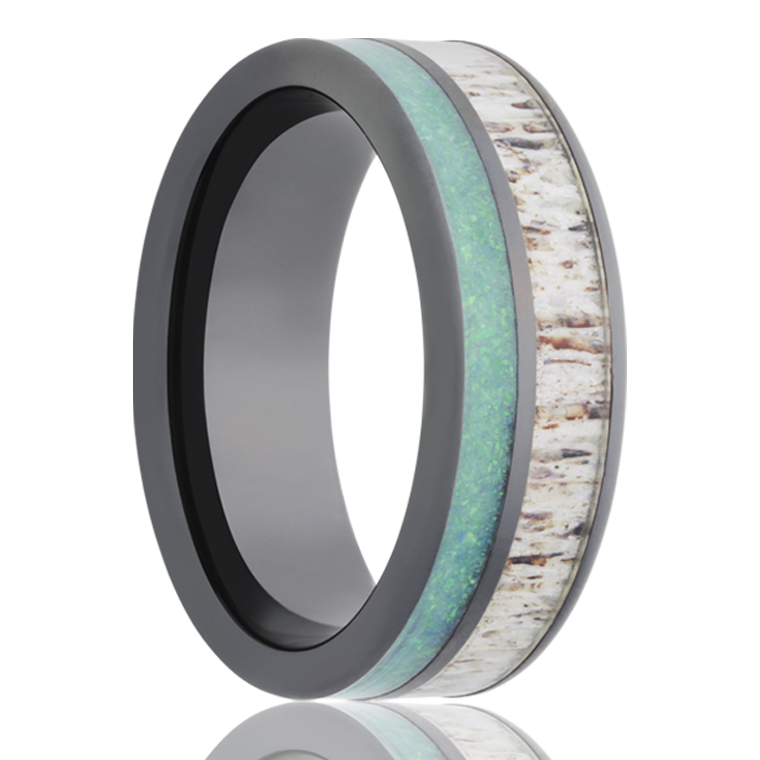 Black Diamond Ceramic ring with a 3mm antler inlay and a 2mm opal inlay. Select width and size then add to cart.