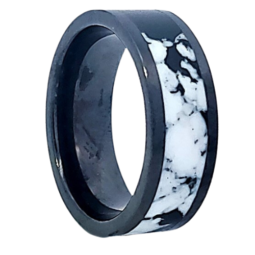 Black Ceramic Flat Polish w/ 5MM White Buffalo Turquoise (Lab Grown). Select width and size then add to cart.