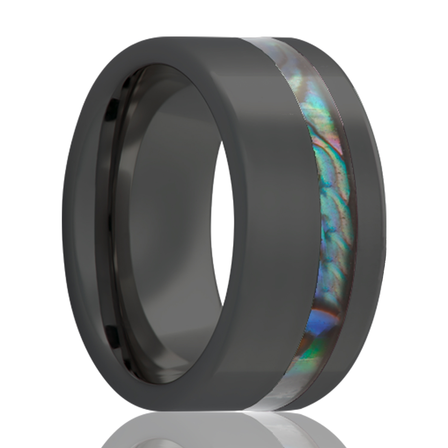 Flat Black Diamond Ceramic ring all high polish with an offset abalone inlay. Select width and size then add to cart.