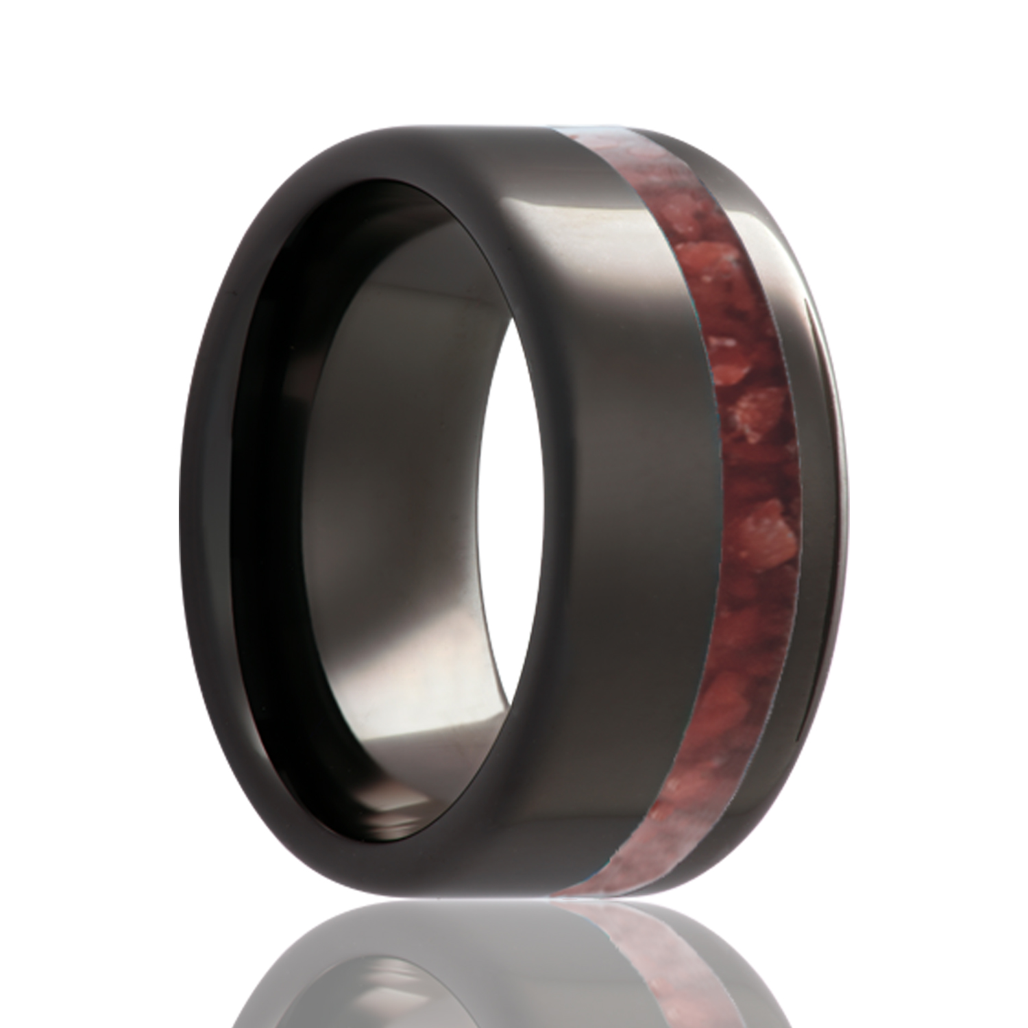 Flat Black Diamond Ceramic ring all high polish with an offset coral inlay. Select width and size then add to cart.