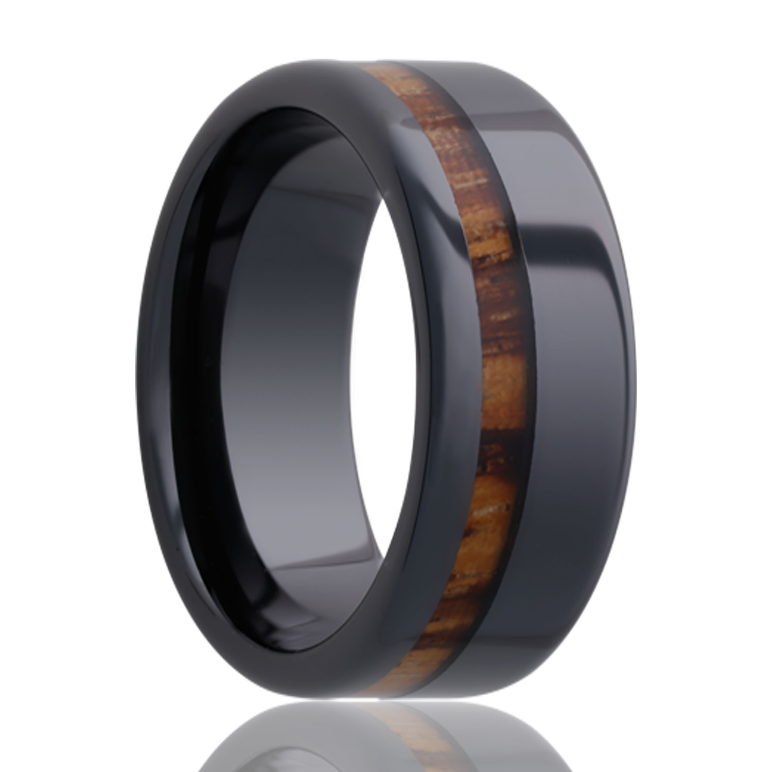 Flat Black Diamond Ceramic ring all high polish with an offset zebra wood inlay. Select width and size then add to cart.