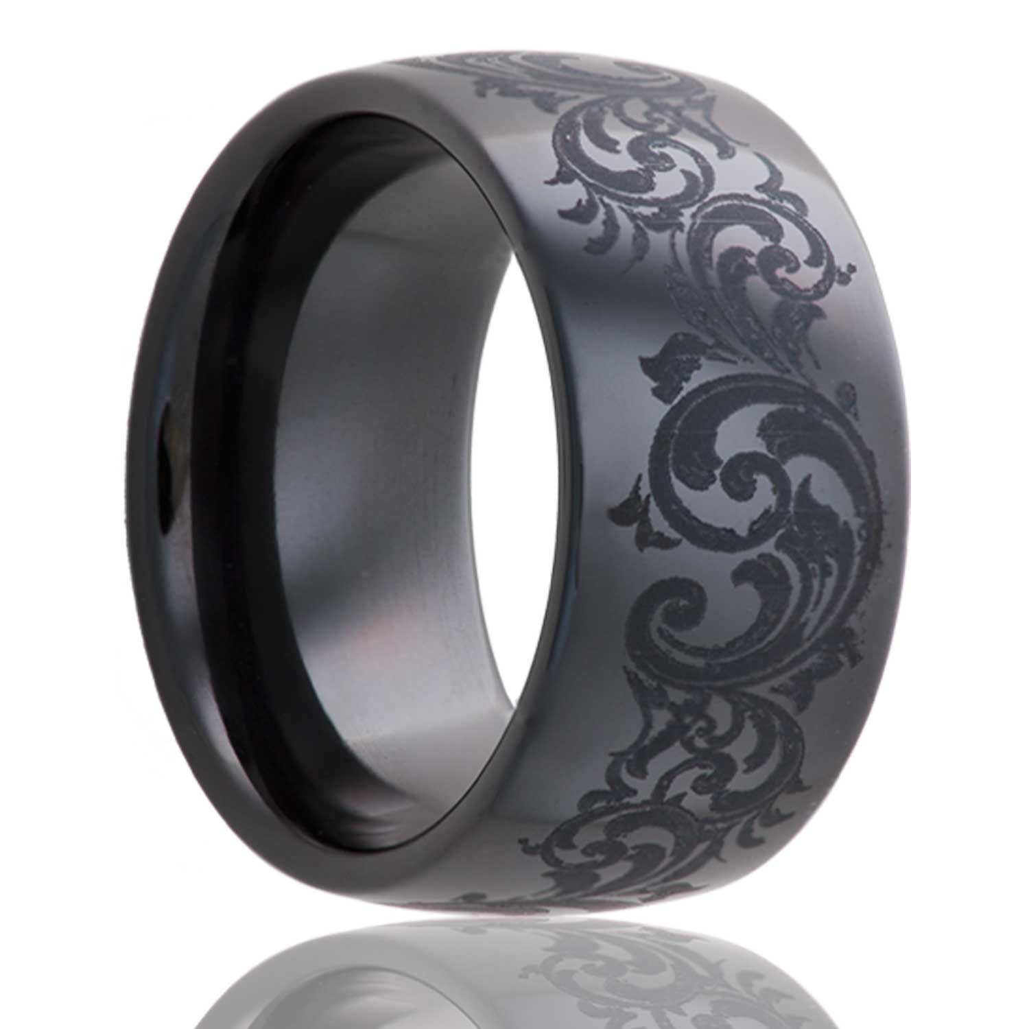 Dome Black Diamond Ceramic ring polished with a laser engraved pattern. Select width and size then add to cart.