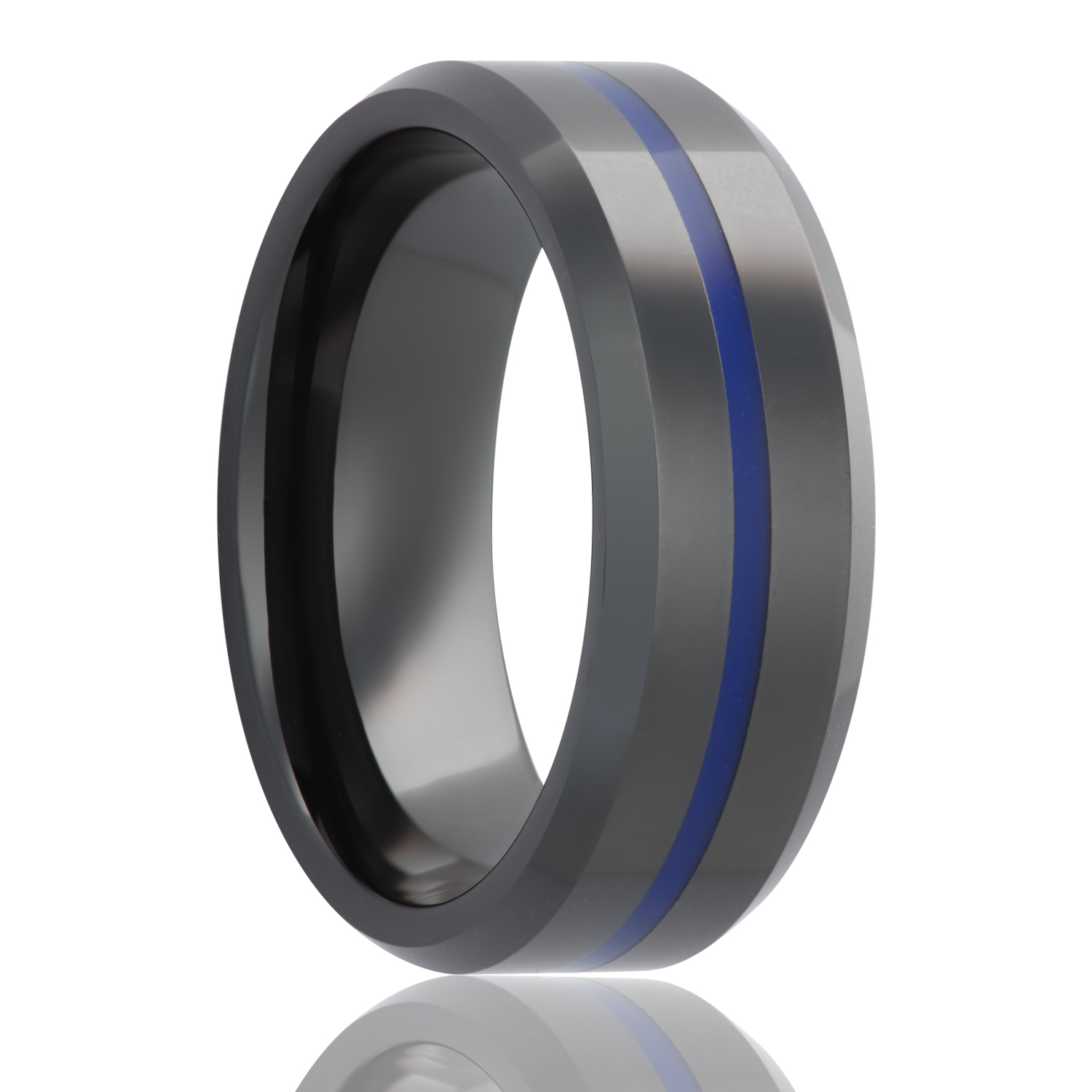 Beveled edge Black Diamond Ceramic ring all high polish with an epoxy thin blue line. Select width and size then add to cart.