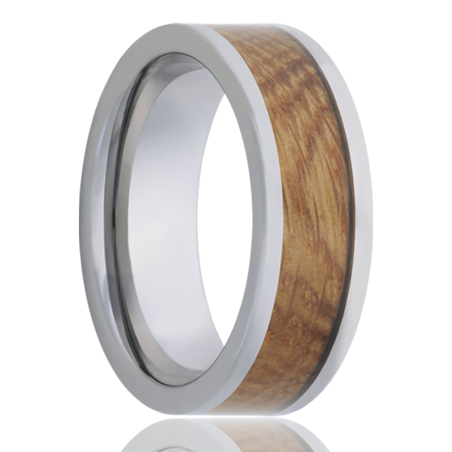 Flat cobalt band with a whiskey barrel wood inlay. Select width and size then add to cart.
