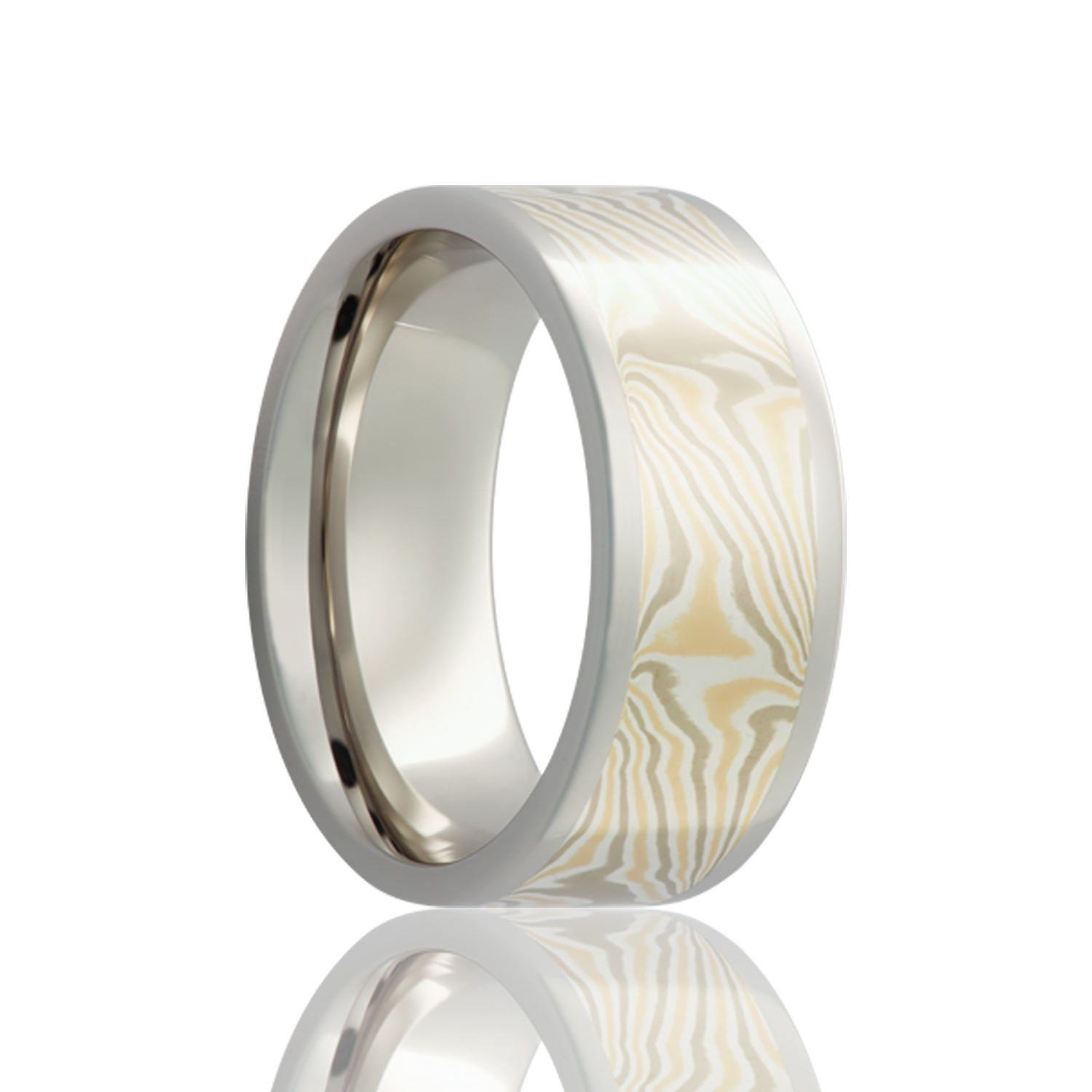 Flat cobalt band, all high polish with a 5mm mokume gane inlay of 14k yellow gold, 14k white gold and silver. Select width and size then add to cart.