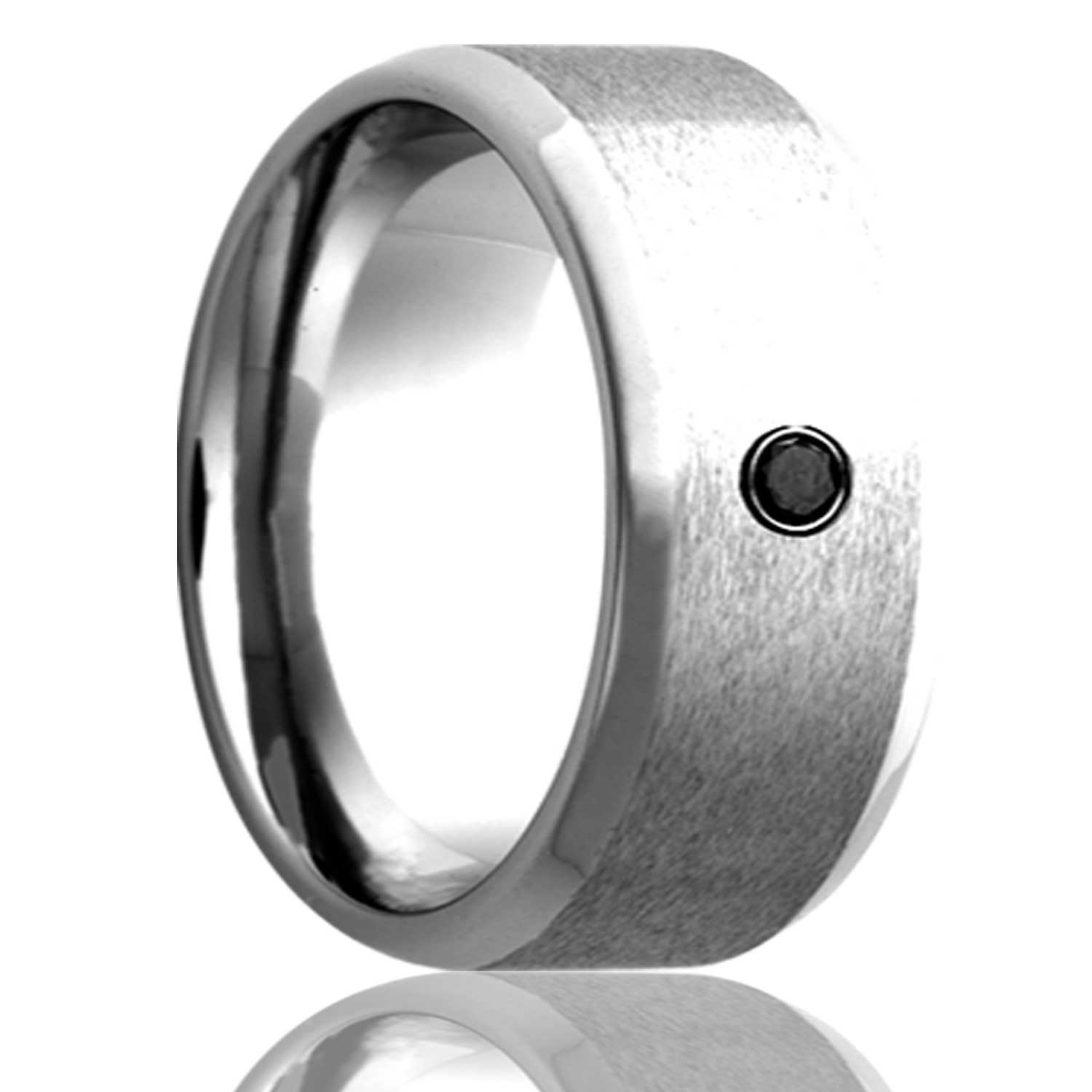Beveled edge Vitalium band, all high polish bevel with a satin finish center, .06 bezel set black diamond. Select width and size then add to cart.
