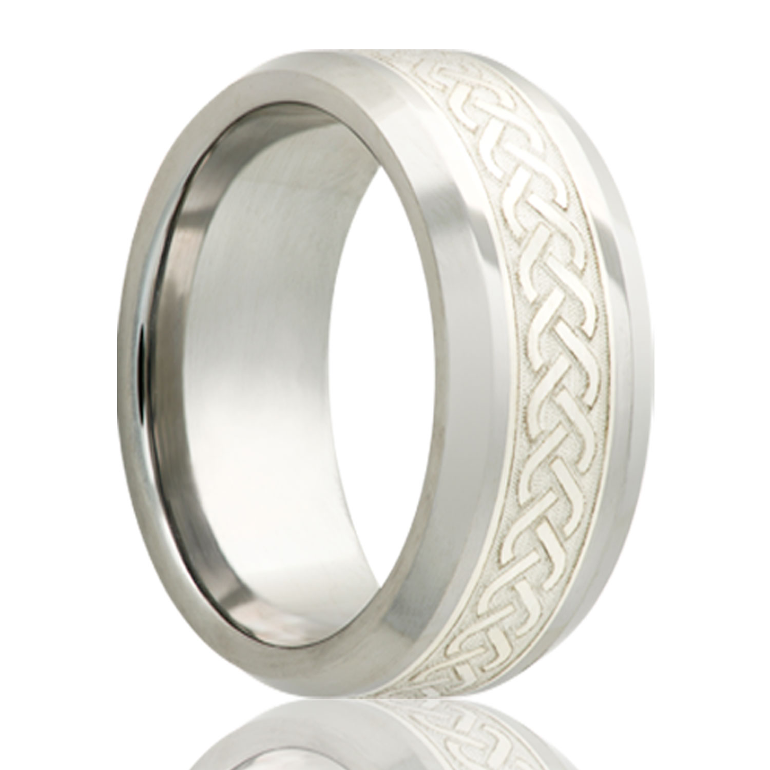 Beveled edge Cobalt band, all high polish with a 4mm engraved silver inlay. Select width and size then add to cart.