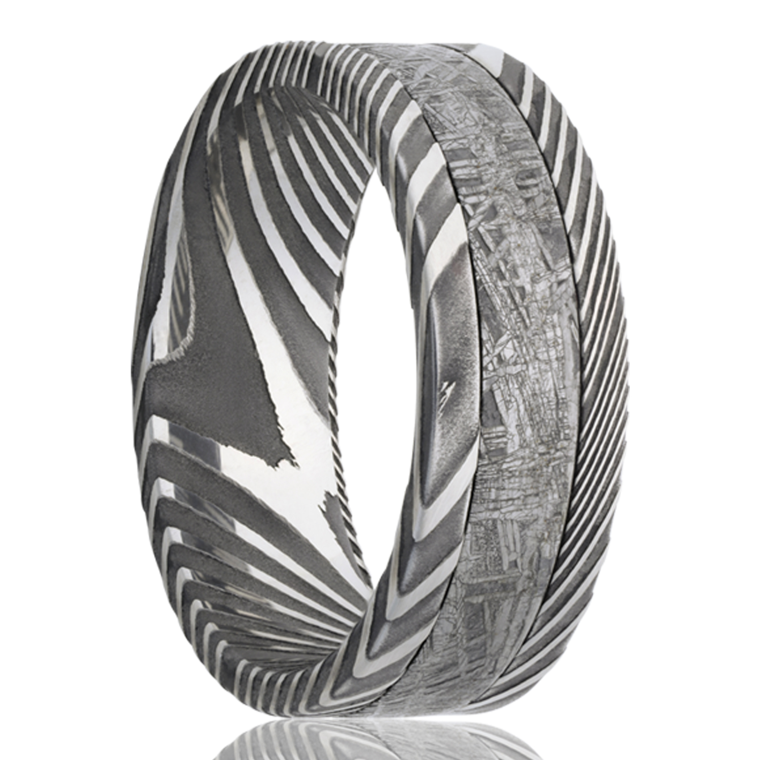 Twisted damascus steel ring with 4mm meteorite inlay. Select width and size then add to cart.