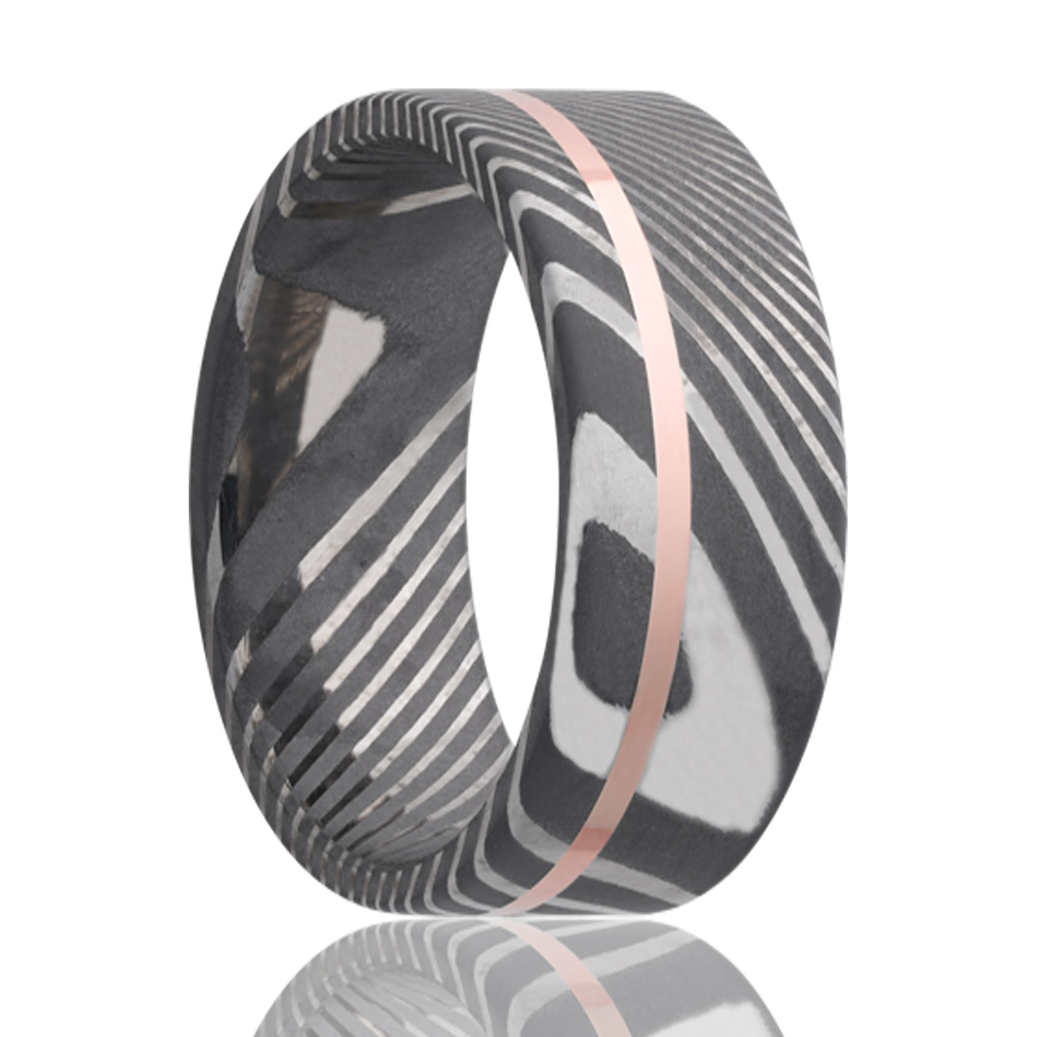 Twisted Damascus Steel ring with 14k rose gold inlay. Select width and size then add to cart.