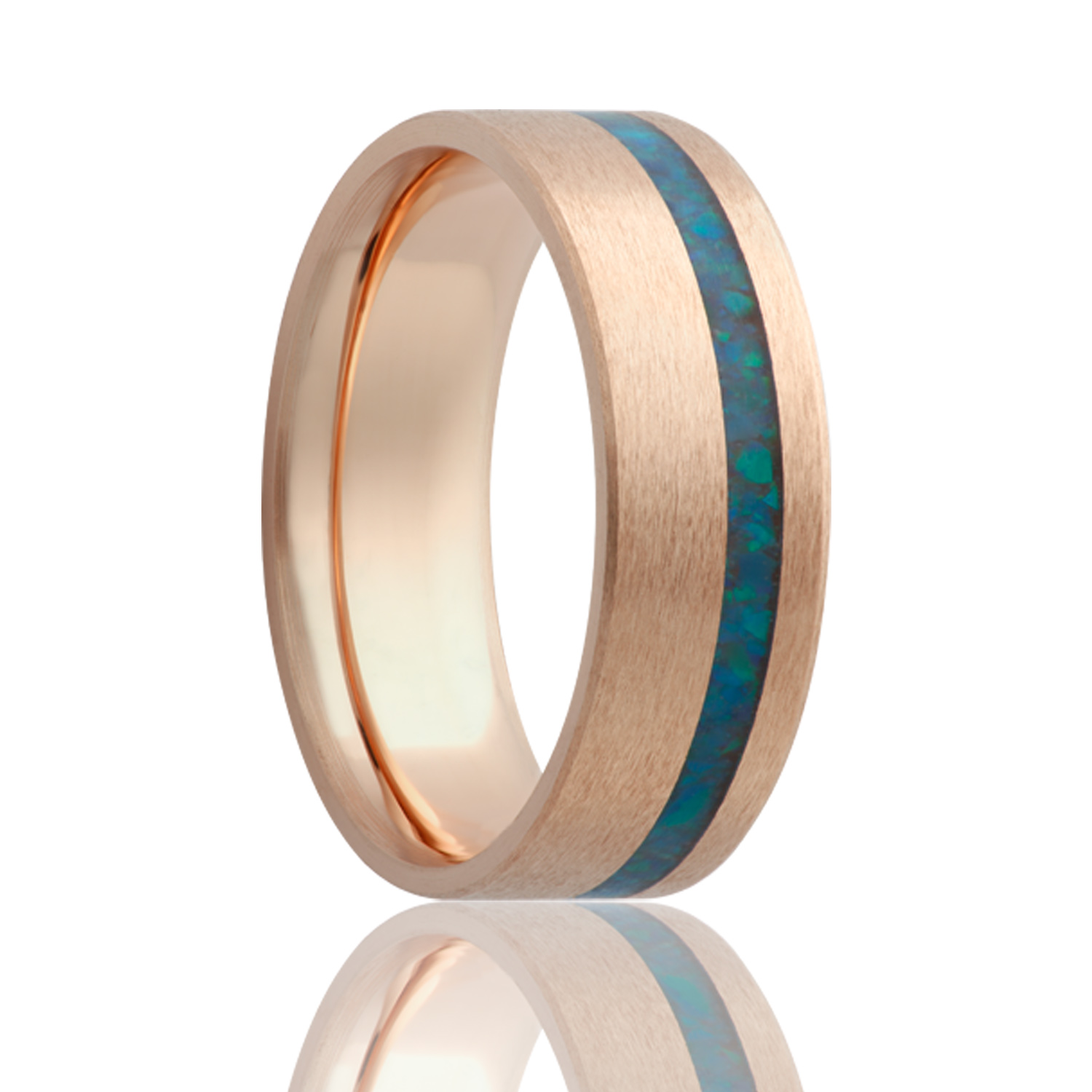 Flat 14k rose gold band, satin finish top with a 1.5mm opal inlay. Precious Metals are a 30% resize fee of current market pricing each time. Select width and size then add to cart.