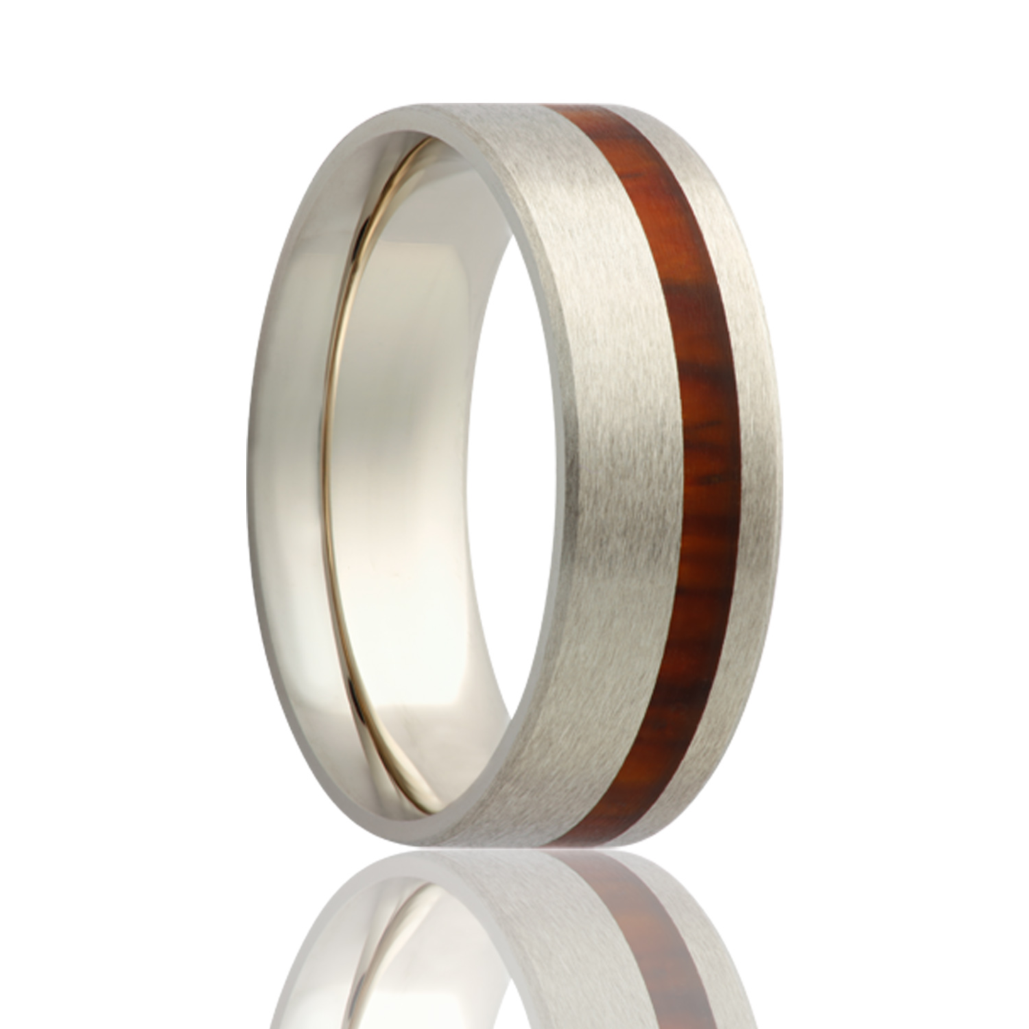 Flat Cobalt band, satin finish top with a 1.5mm cocobolo wood inlay. Select width and size then add to cart.