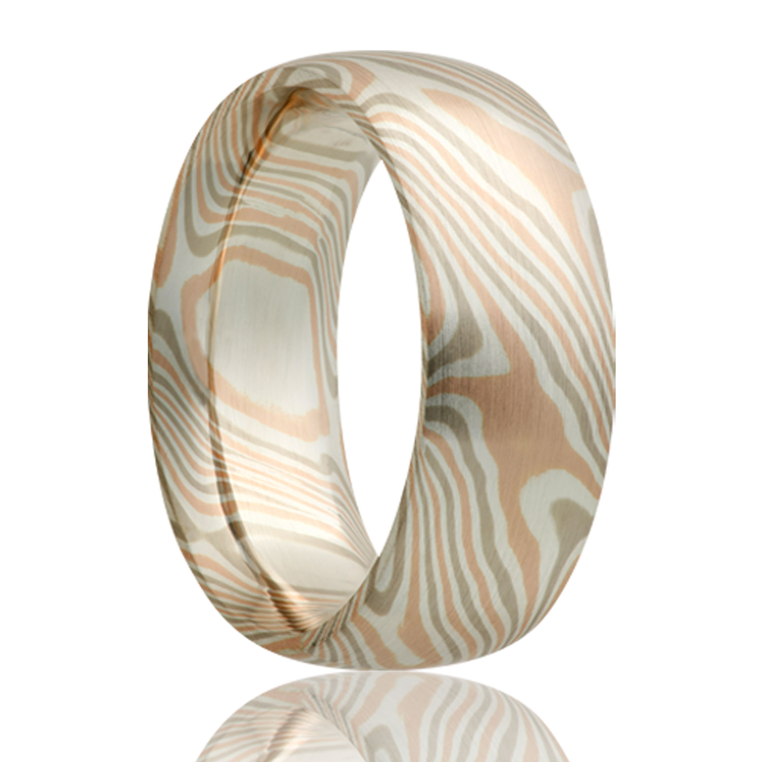 SKU: n/a.Dome Palladium, sterling silver, and 14k rose gold Mokume Gane band. Precious Metals are a 30% resize fee of current market pricing each time. Select width and size then add to cart.