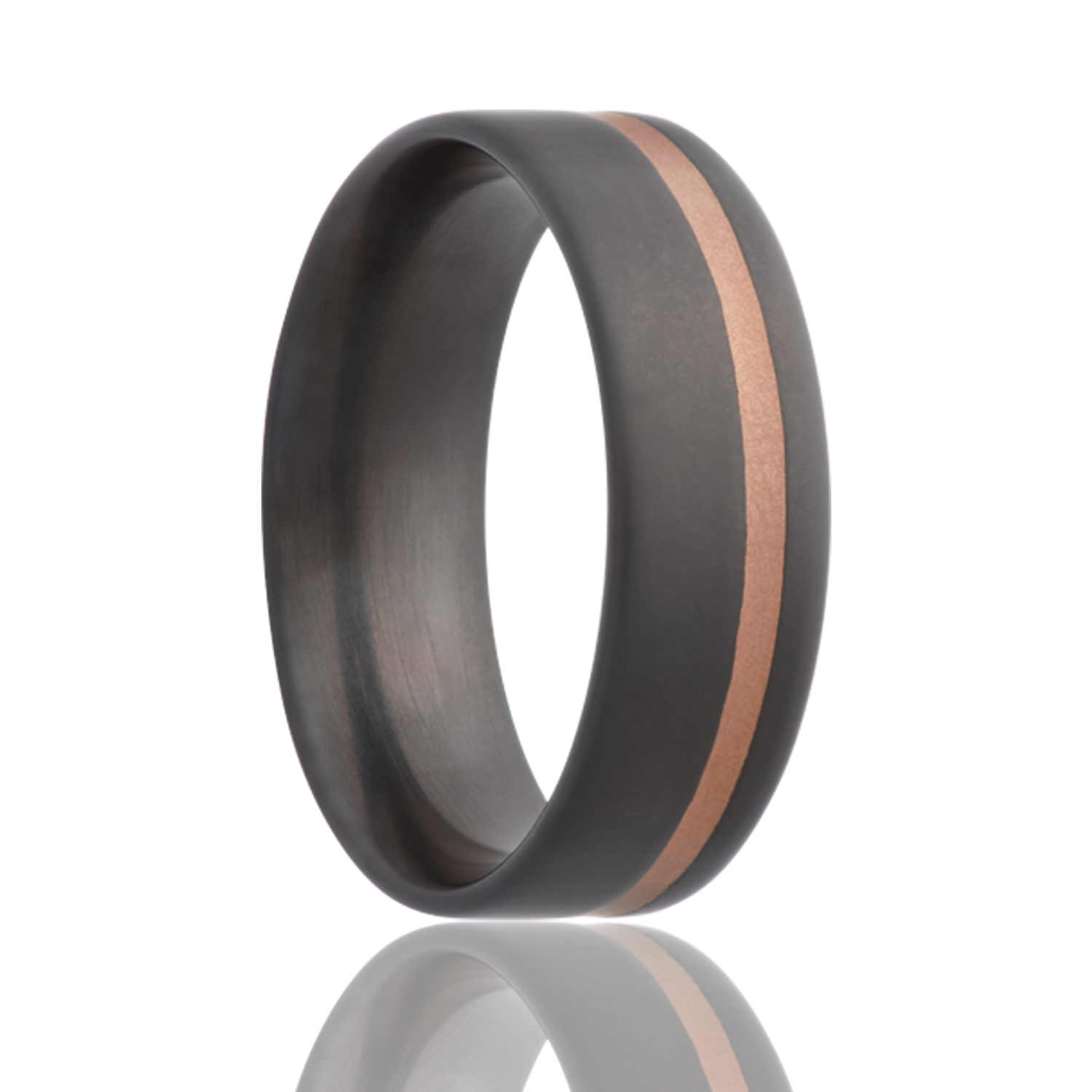 Flat Zirconium band, sandblast finish with 1mm 14k rose gold inlay. Select width and size then add to cart.