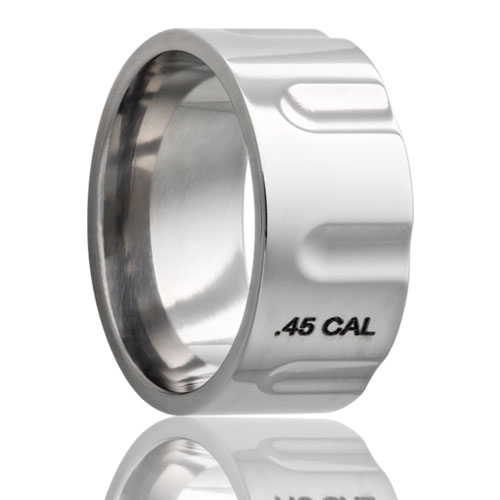 Flat Titanium ring with a milled pattern and a laser engraving (.45 CAL).
