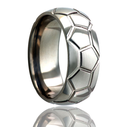 Dome Titanium ring with a soccer pattern. Select width and size then add to cart.