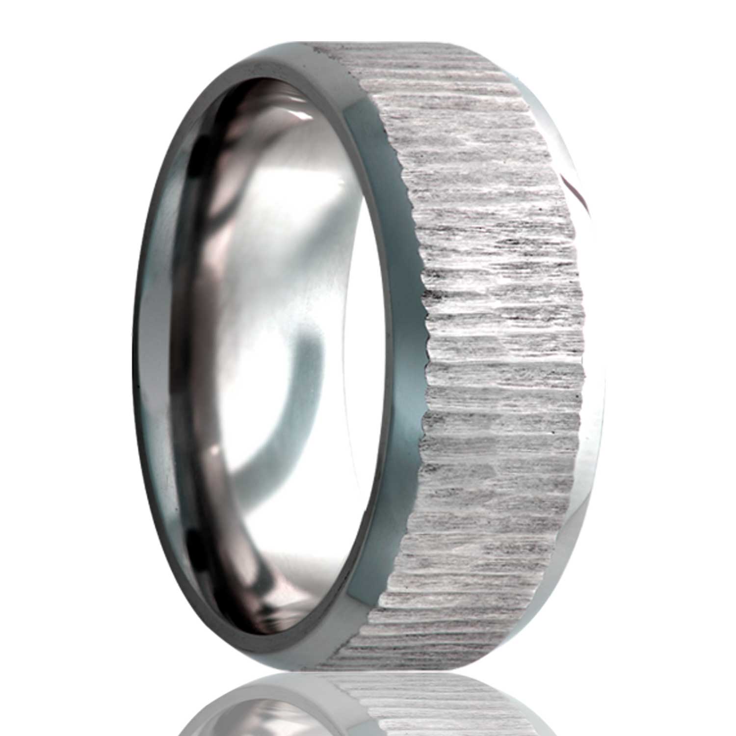 Beveled edge Titanium ring polished with a treebark finish on top. Select width and size then add to cart.