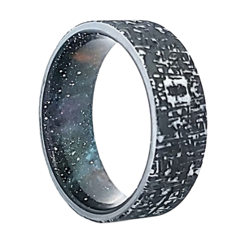 Tungsten Flat Polish & Engraved Meteorite Pattern w/ Galaxy Pattern Cerakote Sleeve. Select width and size then add to cart.