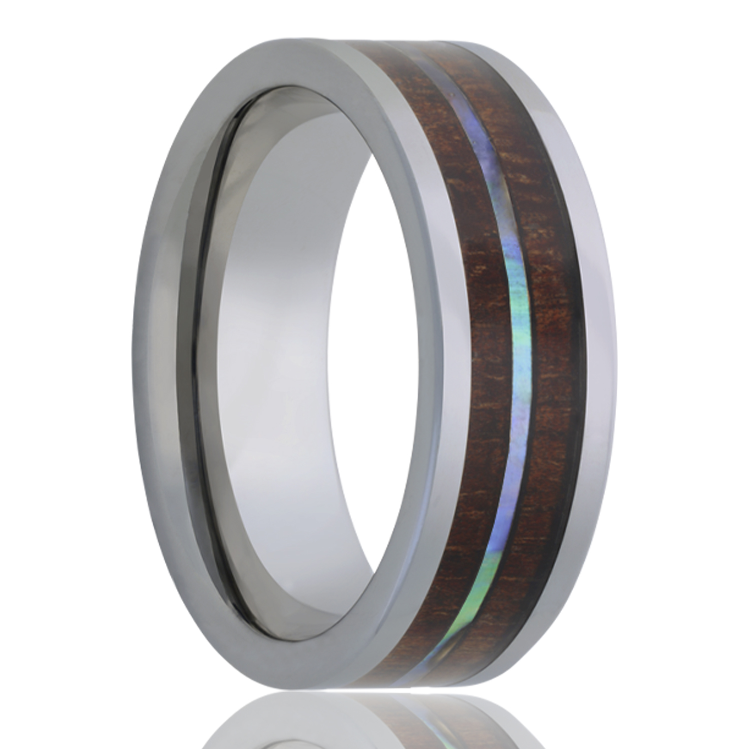 Flat Tungsten band, all high polish with a 5mm koa wood inlay and a 1mm abalone inlay. Select width and size then add to cart.