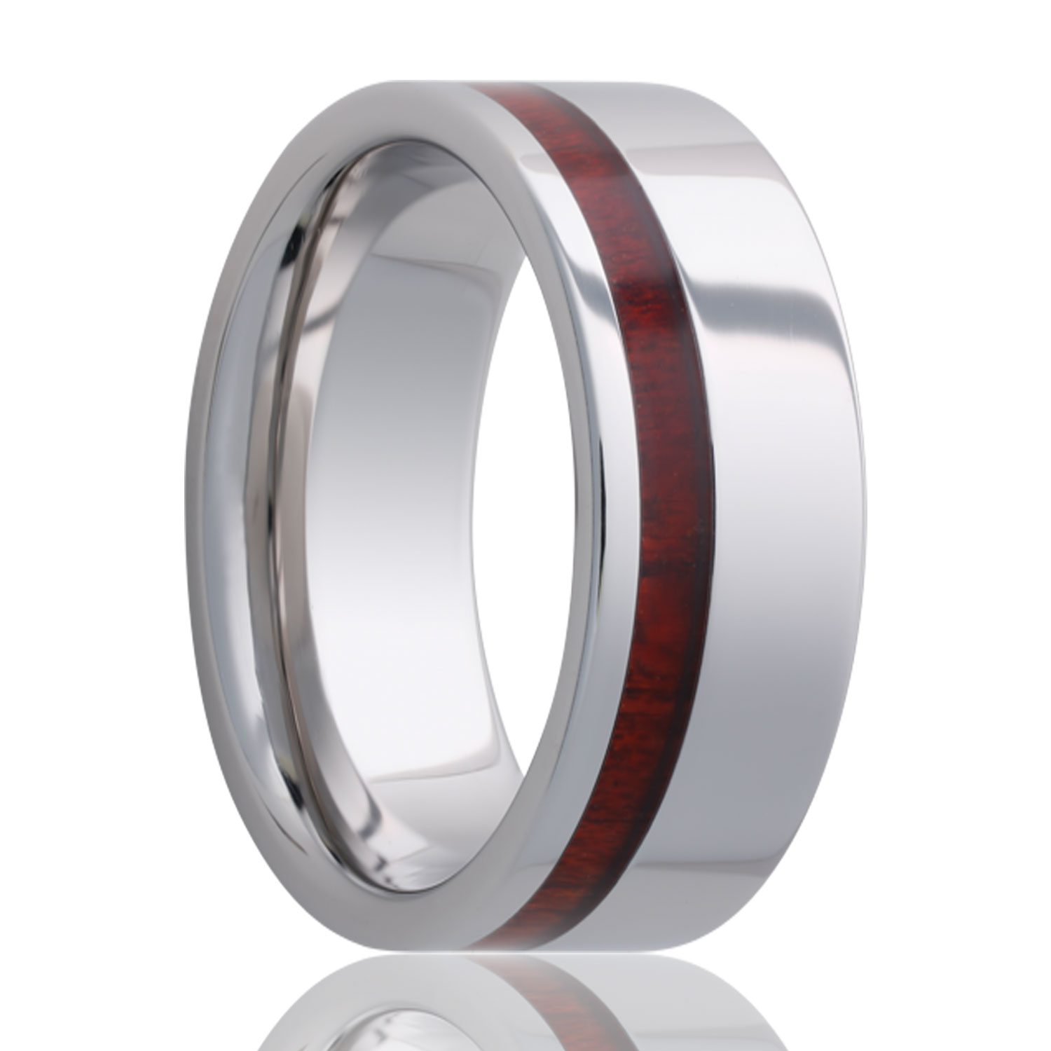 Beveled edge Tungsten band, all high polish with a blood wood inlay. Select width and size then add to cart.