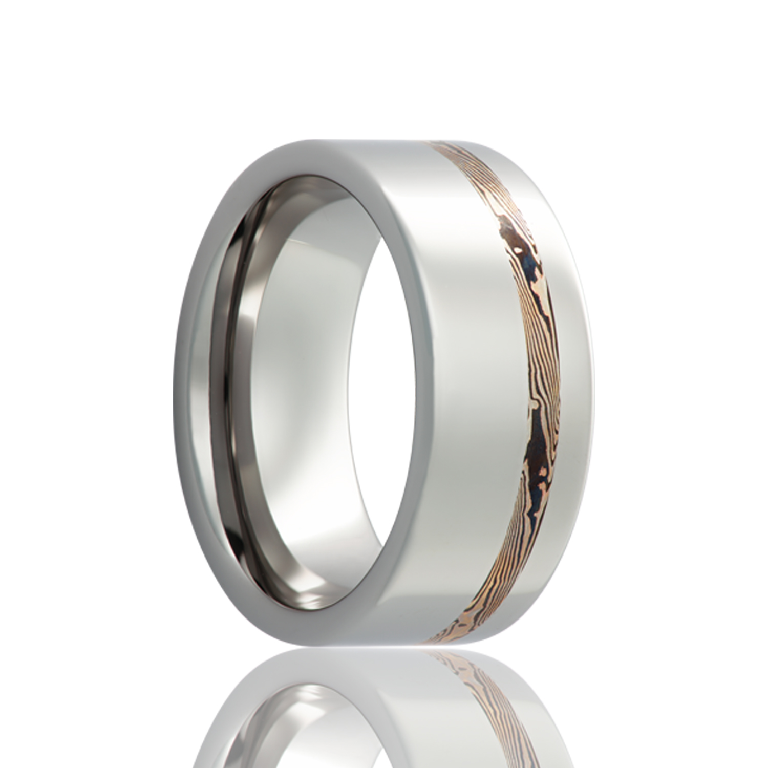 Flat tungsten band, all high polish with an offset 1.5mm mokume gane inlay of 14k white gold and shakudo. Select width and size then add to cart.