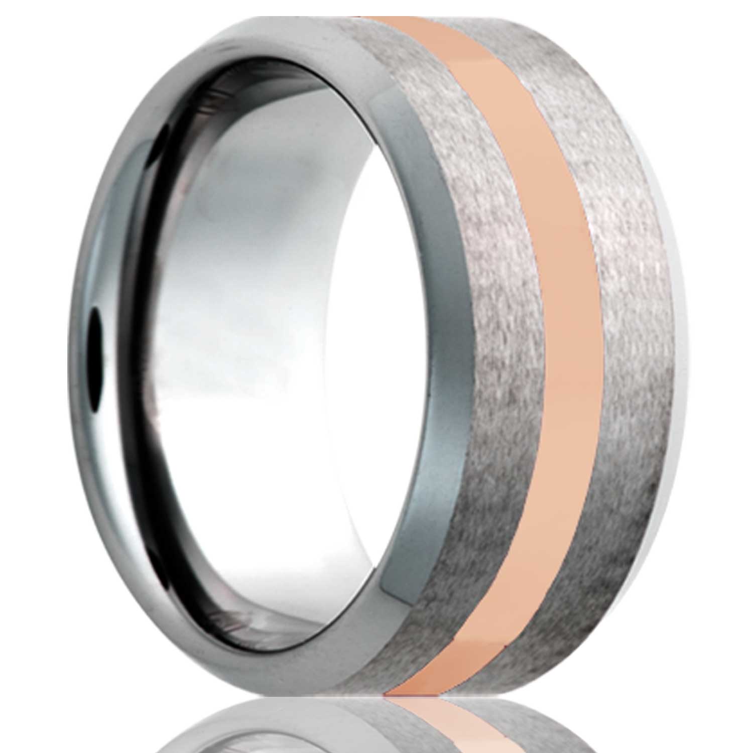 Beveled edge Tungsten band, polished bevels and a satin finish center with a 2mm 14k rose gold inlay. Select width and size then add to cart.