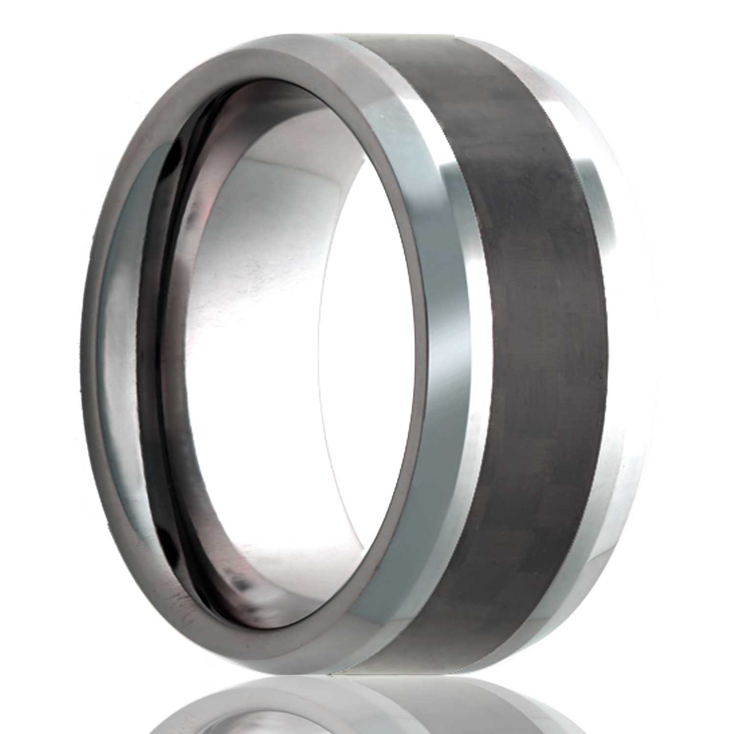 Beveled edge Tungsten ring with a 4mm carbon fiber inlay. Select width and size then add to cart.