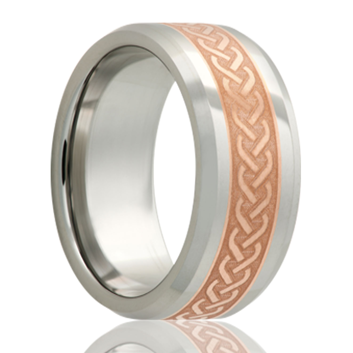 Beveled edge Tungsten band, all high polish with a 4mm engraved copper inlay. Select width and size then add to cart.