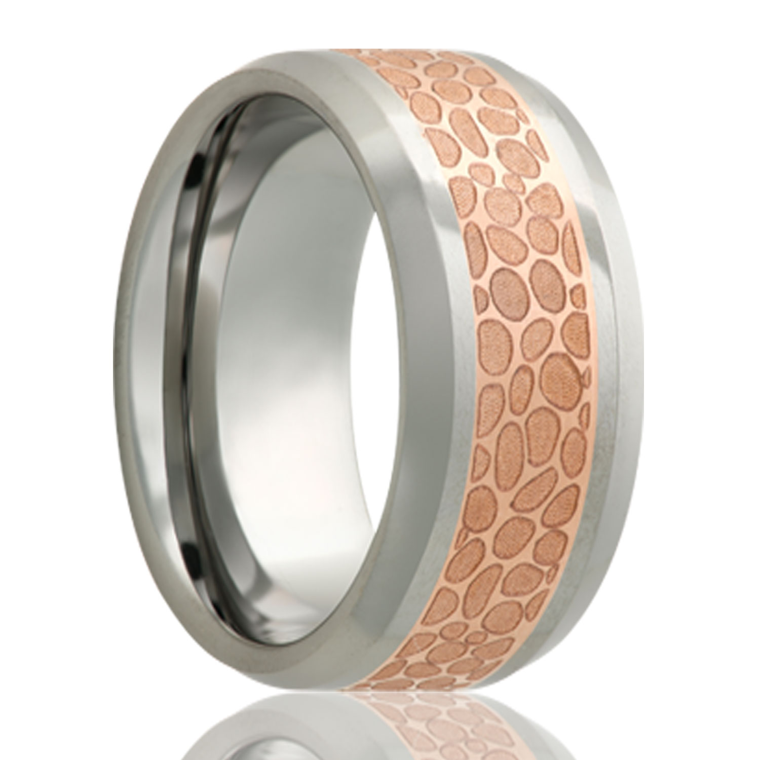 Beveled edge Tungsten band, all high polish with a 4mm engraved copper inlay. Select width and size then add to cart.