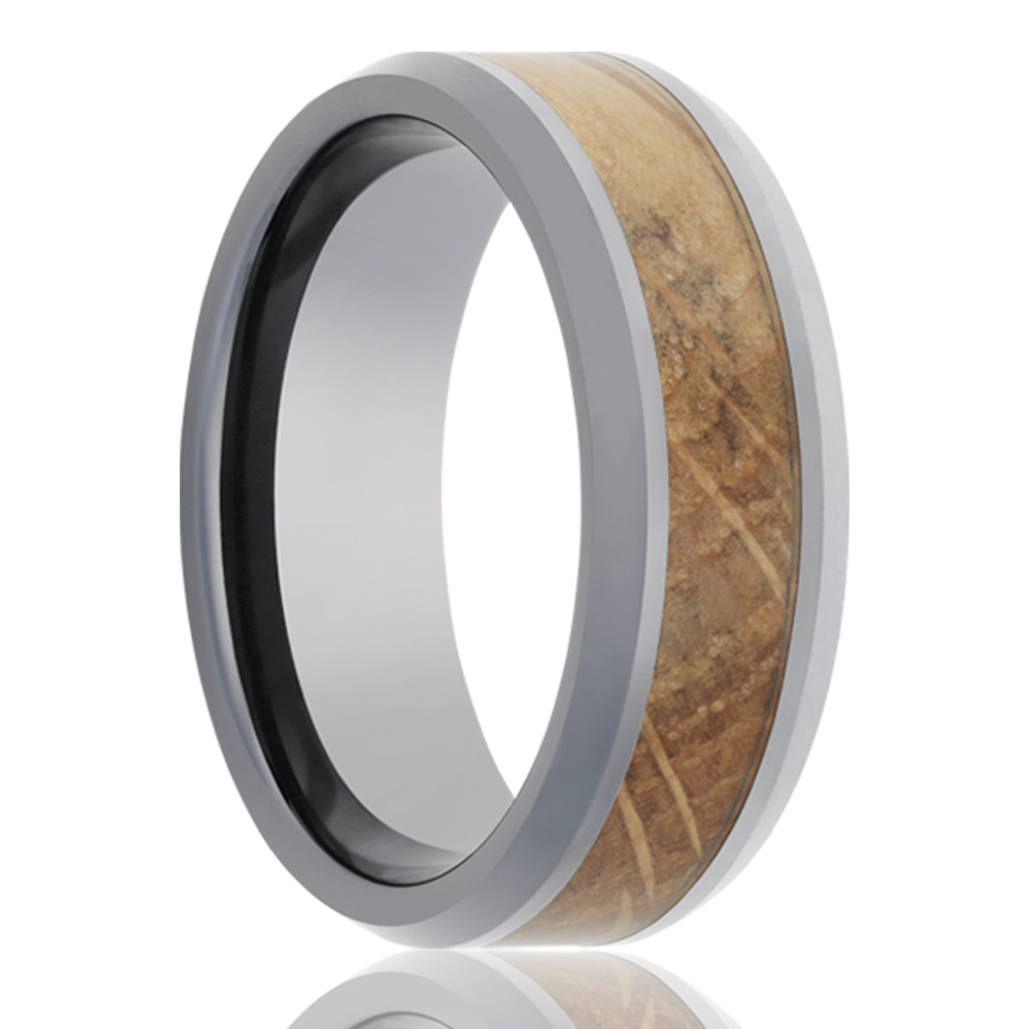 Beveled edge Tungsten band, all high polish with a 4mm whiskey barrel wood inlay. Select width and size then add to cart.