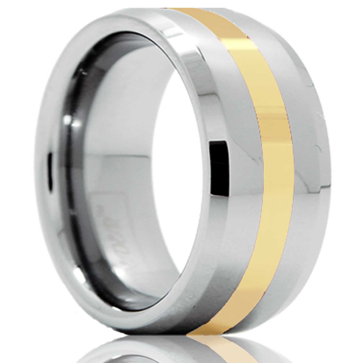 Beveled edge Tungsten band, all high polish with a 2mm 14k yellow gold inlay. Select width and size then add to cart.