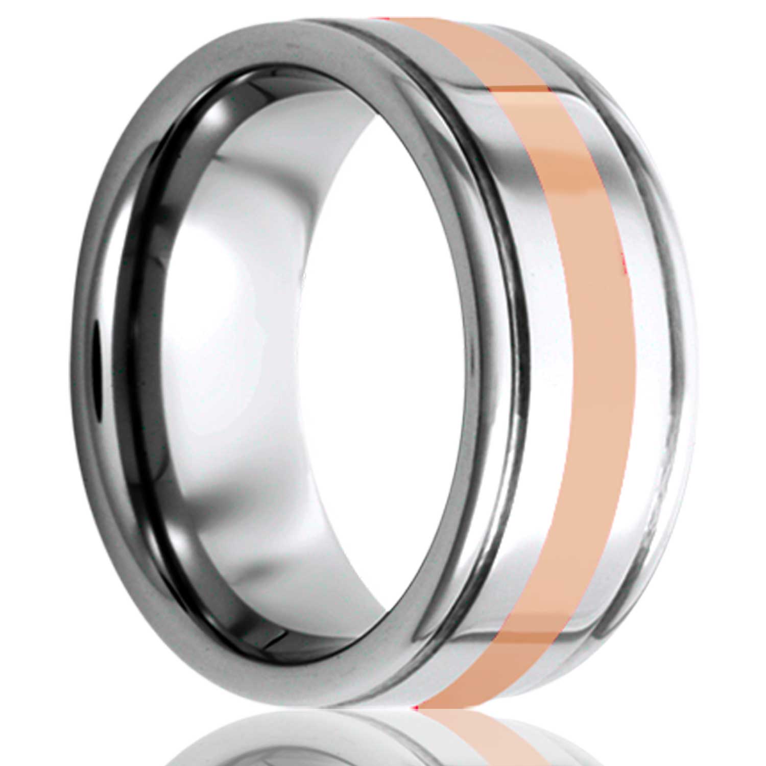 Deep grooved Tungsten band, all high polish with a 2mm 14k rose gold inlay. Select width and size then add to cart.