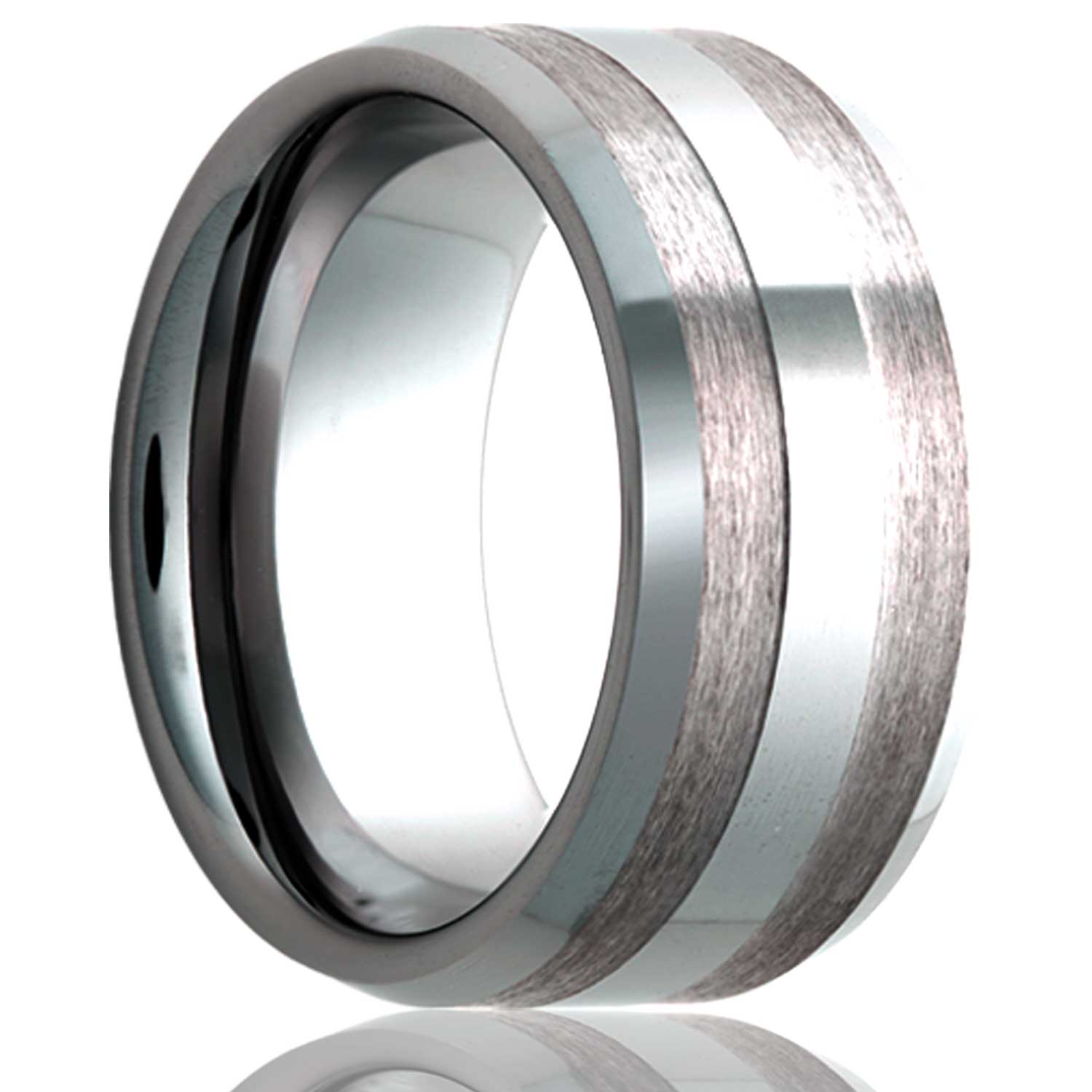 Beveled edge Tungsten band, high polish bevels and center with two satin finishes on the top. This ring is made to look like an inlay but is is not. Select width and size then add to cart.