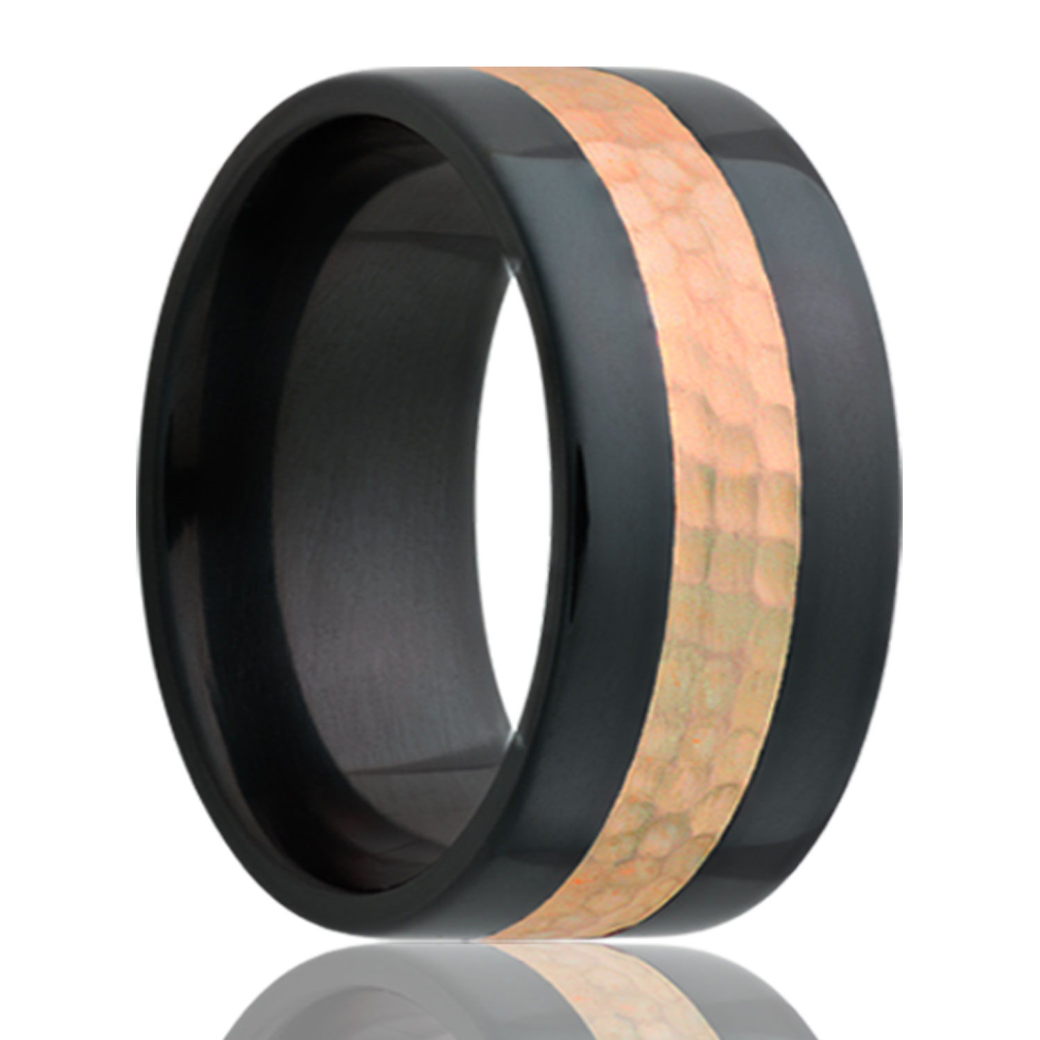 Flat Zirconium band, all high polish with 3mm 14k rose gold hammered inlay. Select width and size then add to cart.