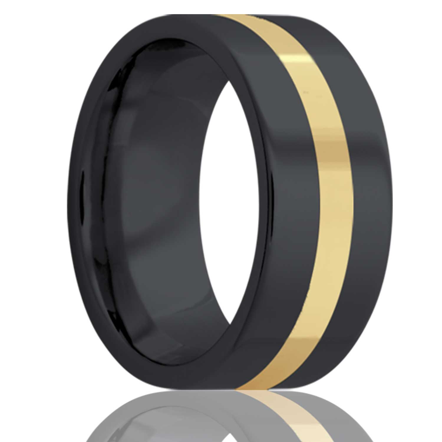 Flat Zirconium band, all high polish with 2mm 14k yellow gold inlay. Select width and size then add to cart.