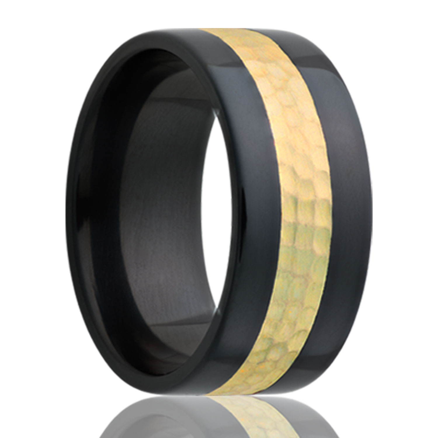 Flat Zirconium band, all high polish with 3mm 14k yellow gold hammered inlay. Select width and size then add to cart.