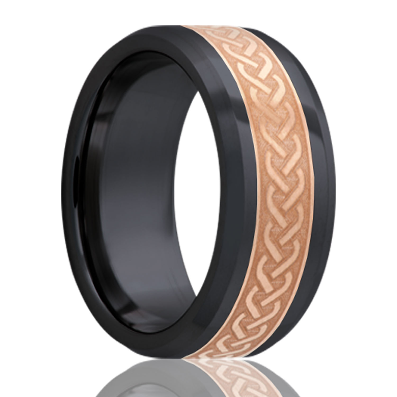 Beveled edge Zirconium band, all high polish with a 4mm engraved copper inlay. Select width and size then add to cart.