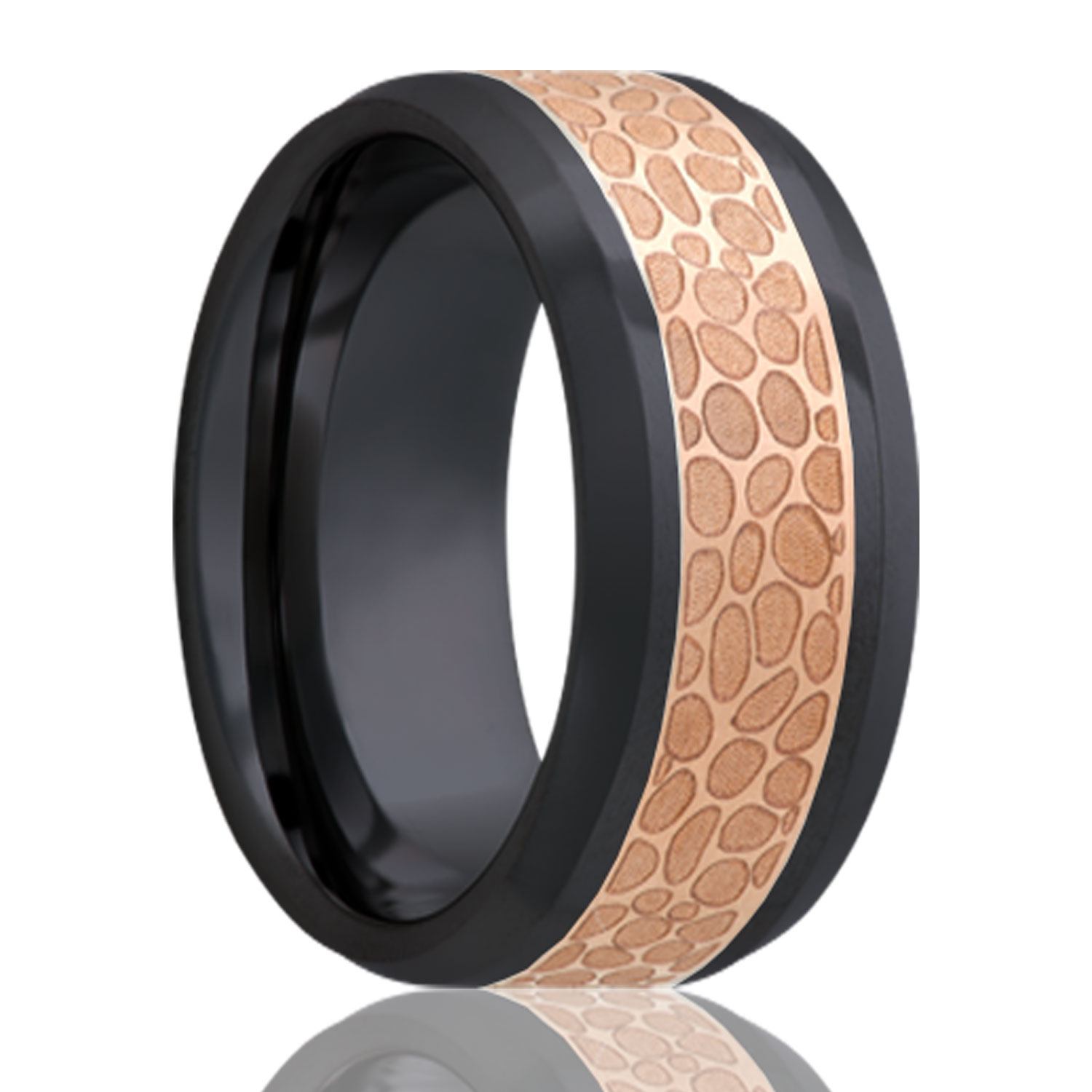 Beveled edge Zirconium band, all high polish with a 4mm engraved copper inlay. Select width and size then add to cart.