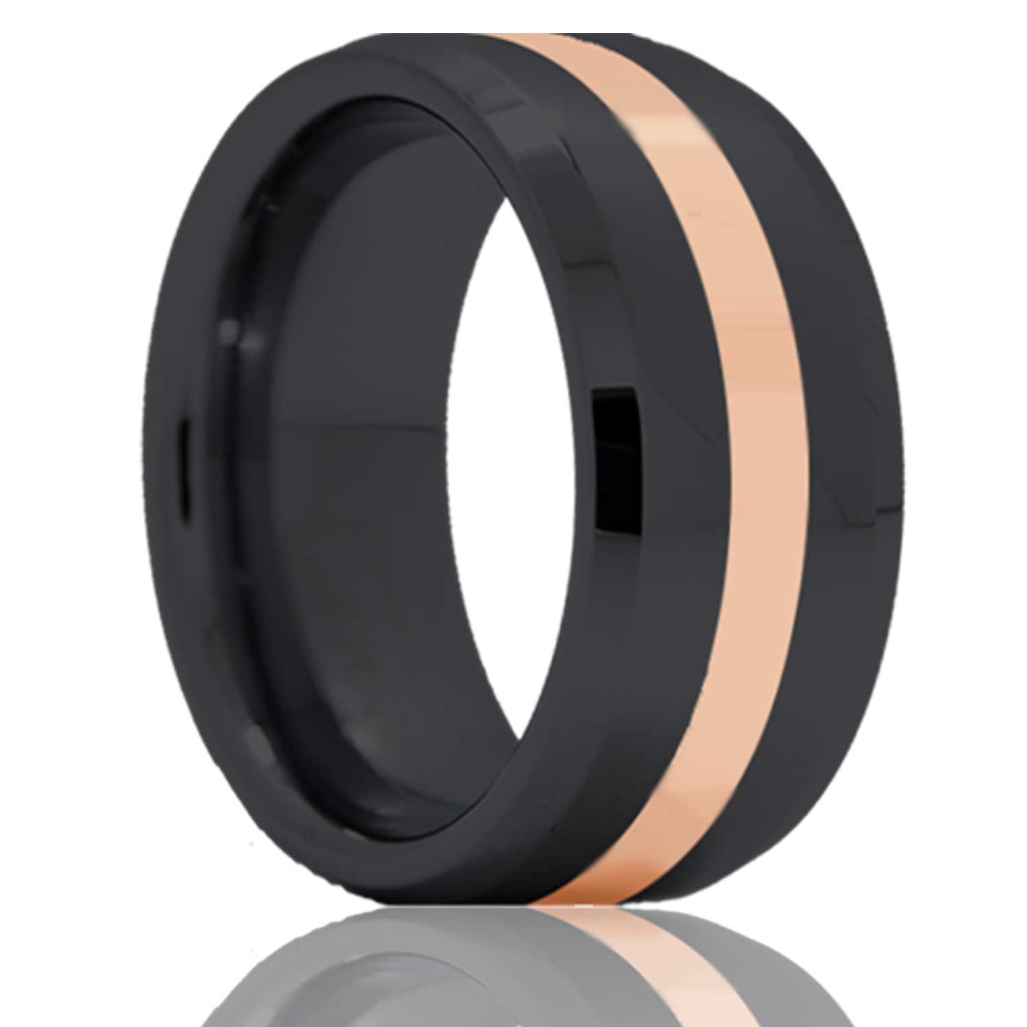 Beveled edge Zirconium band, all high polish with a 2mm 14k rose gold inlay. Select width and size then add to cart.