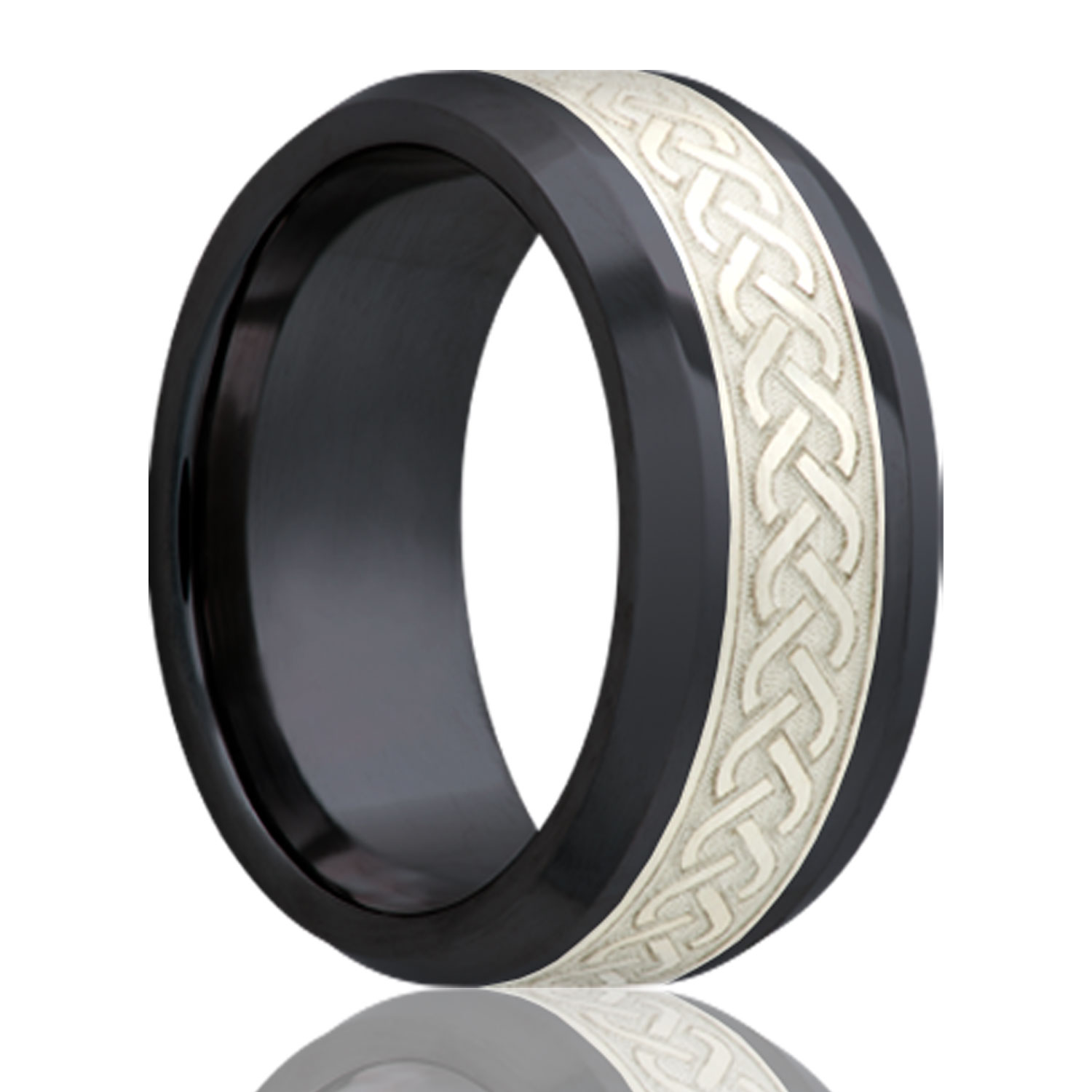 Beveled edge Zirconium band, all high polish with a 4mm engraved silver inlay. Select width and size then add to cart.