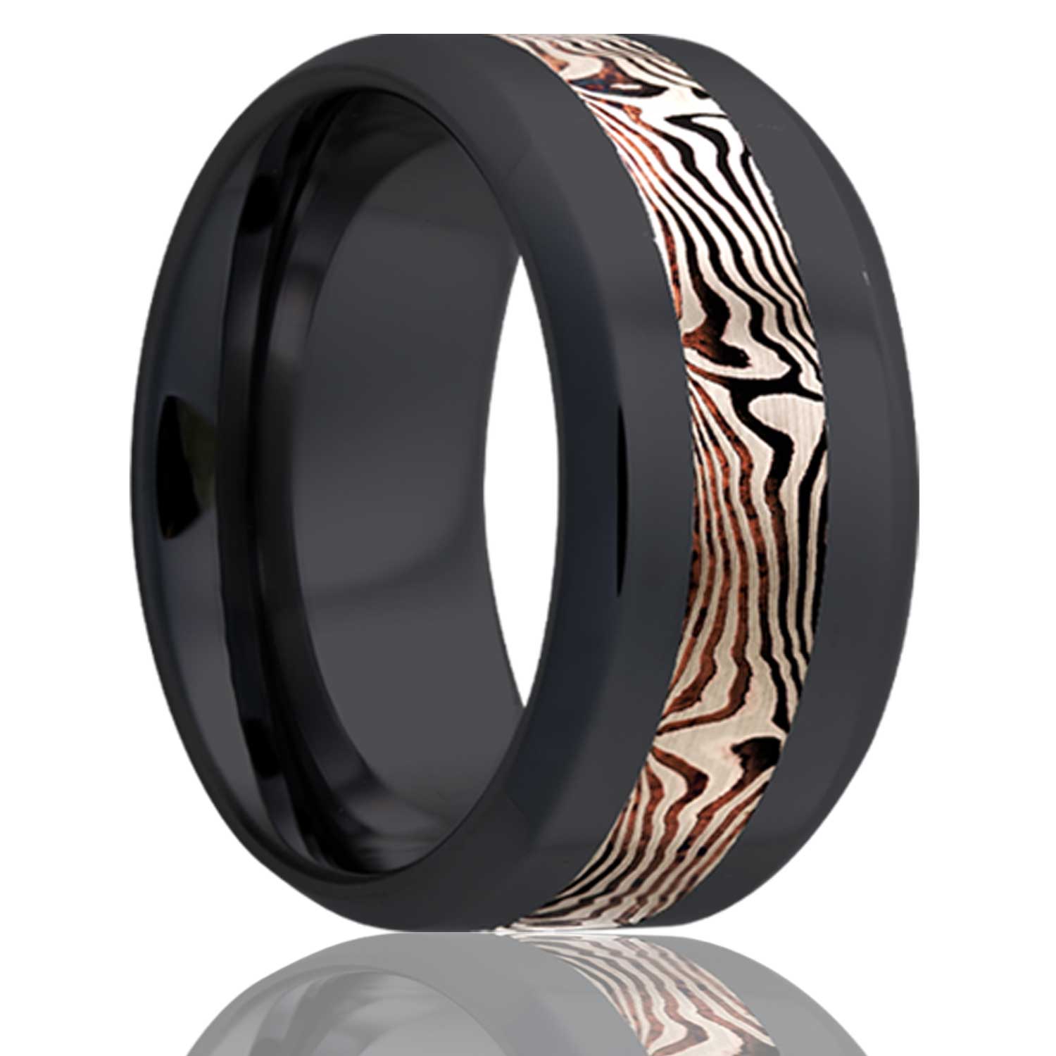 Beveled edge Zirconium band, all high polish with a 3mm mokume gane inlay of 14k white gold and shakudo. Select width and size then add to cart.