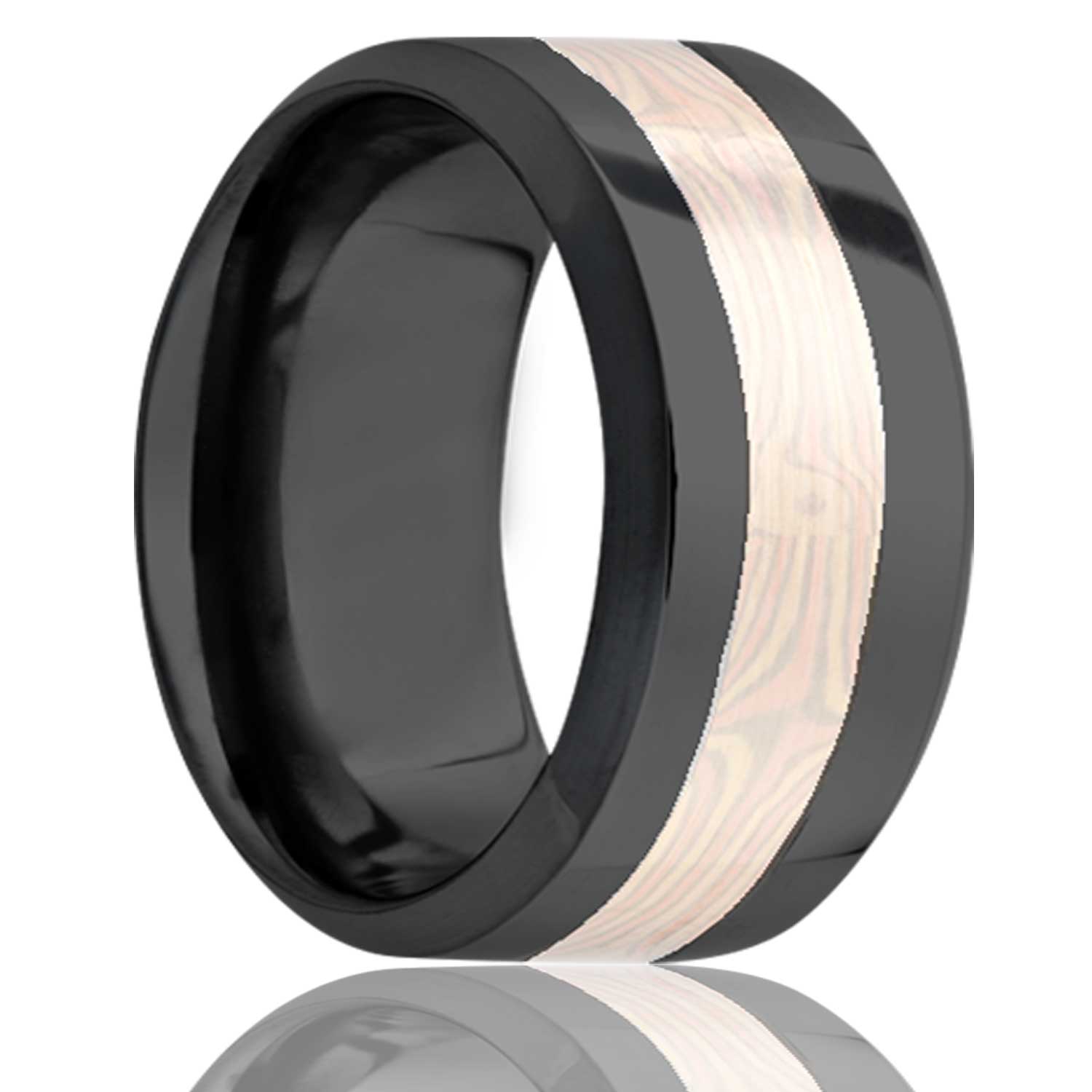 Beveled edge Zirconium band, all high polish with a 3mm mokume gane inlay of 14k yellow gold, 14k rose gold, and 14k white gold. Select width and size then add to cart.