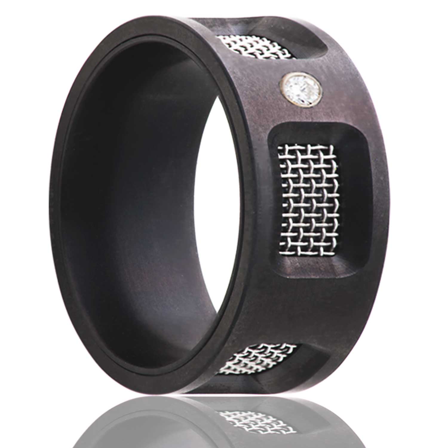Flat Zirconium band, with mesh screen and one .06 diamond. Select stone type, width and size then add to cart.