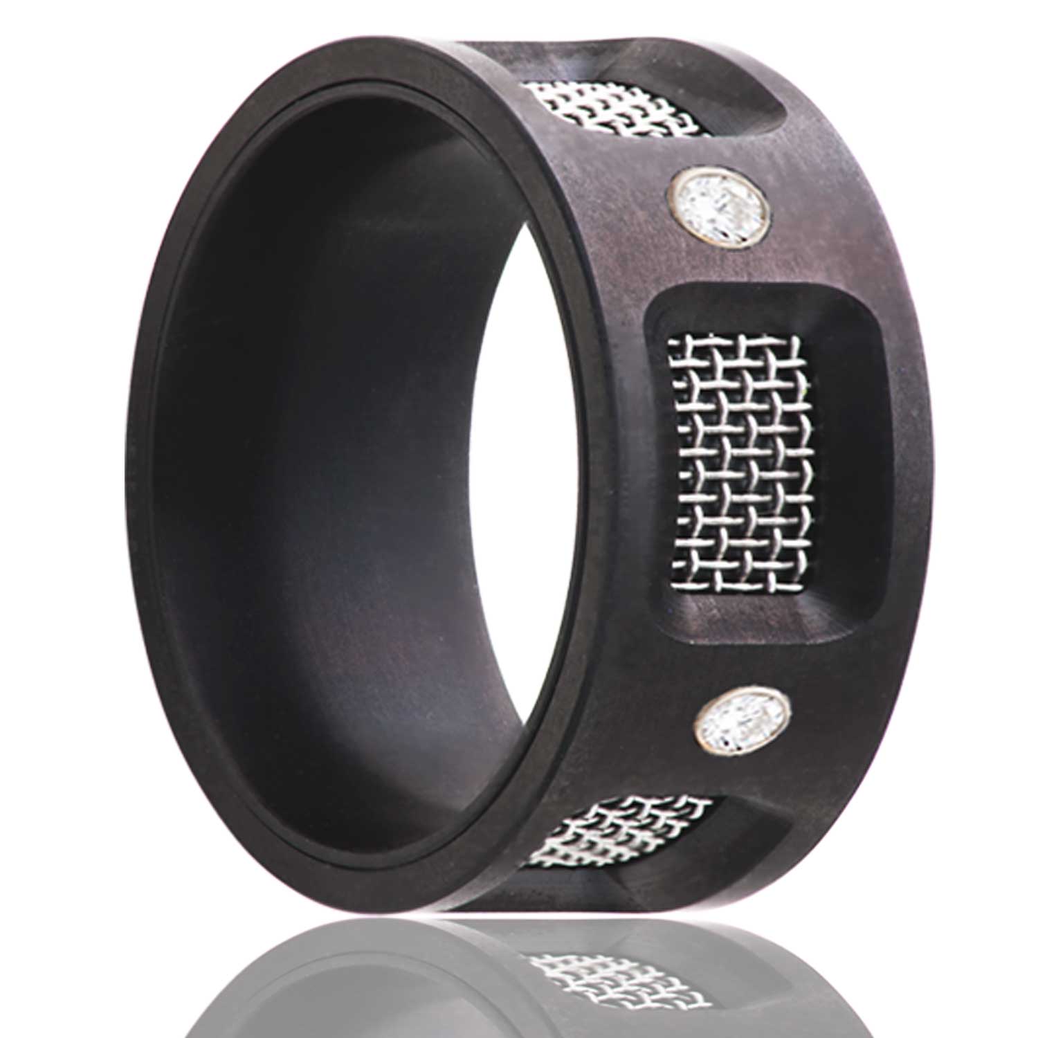 Flat Zirconium band, with mesh screen and five .06 diamonds. Select stone type, width and size then add to cart.