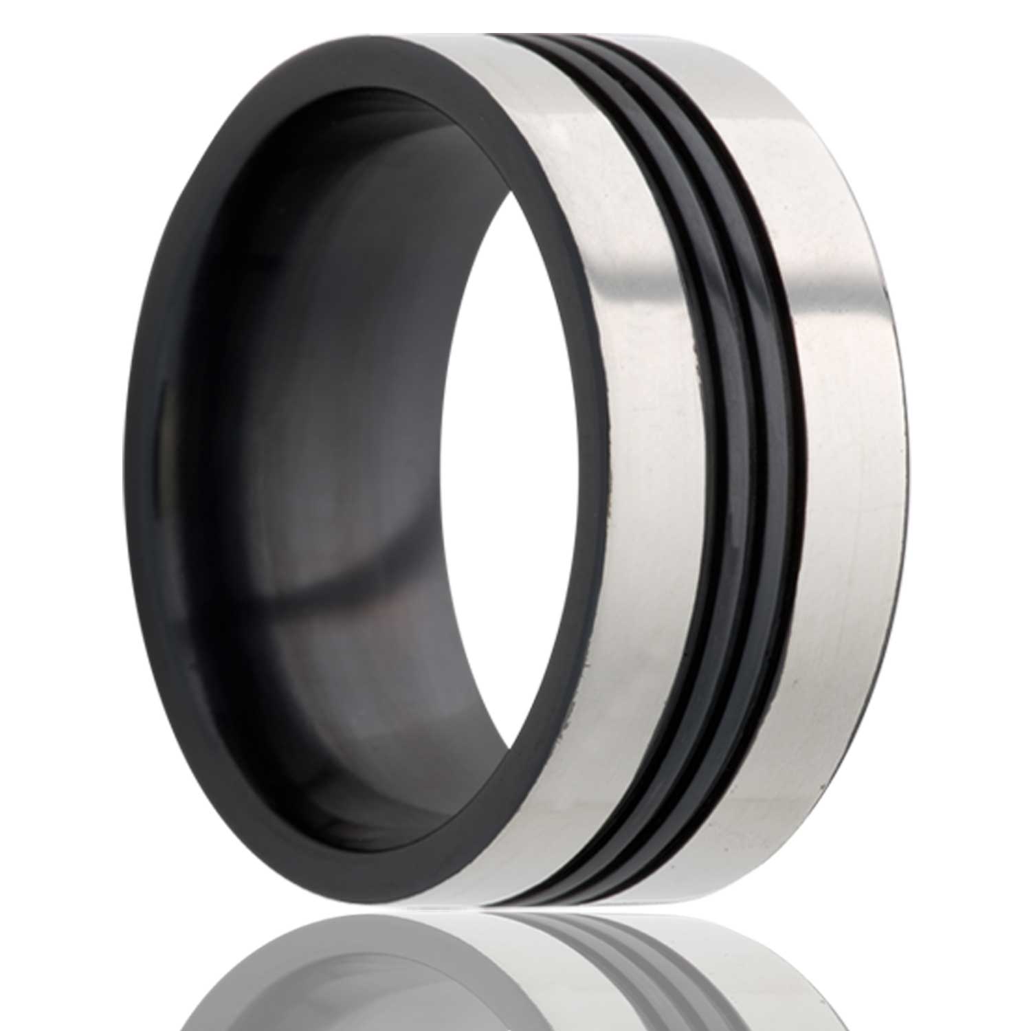 Flat Zirconium ring with three grooves black with polished edges. Select width and size then add to cart.