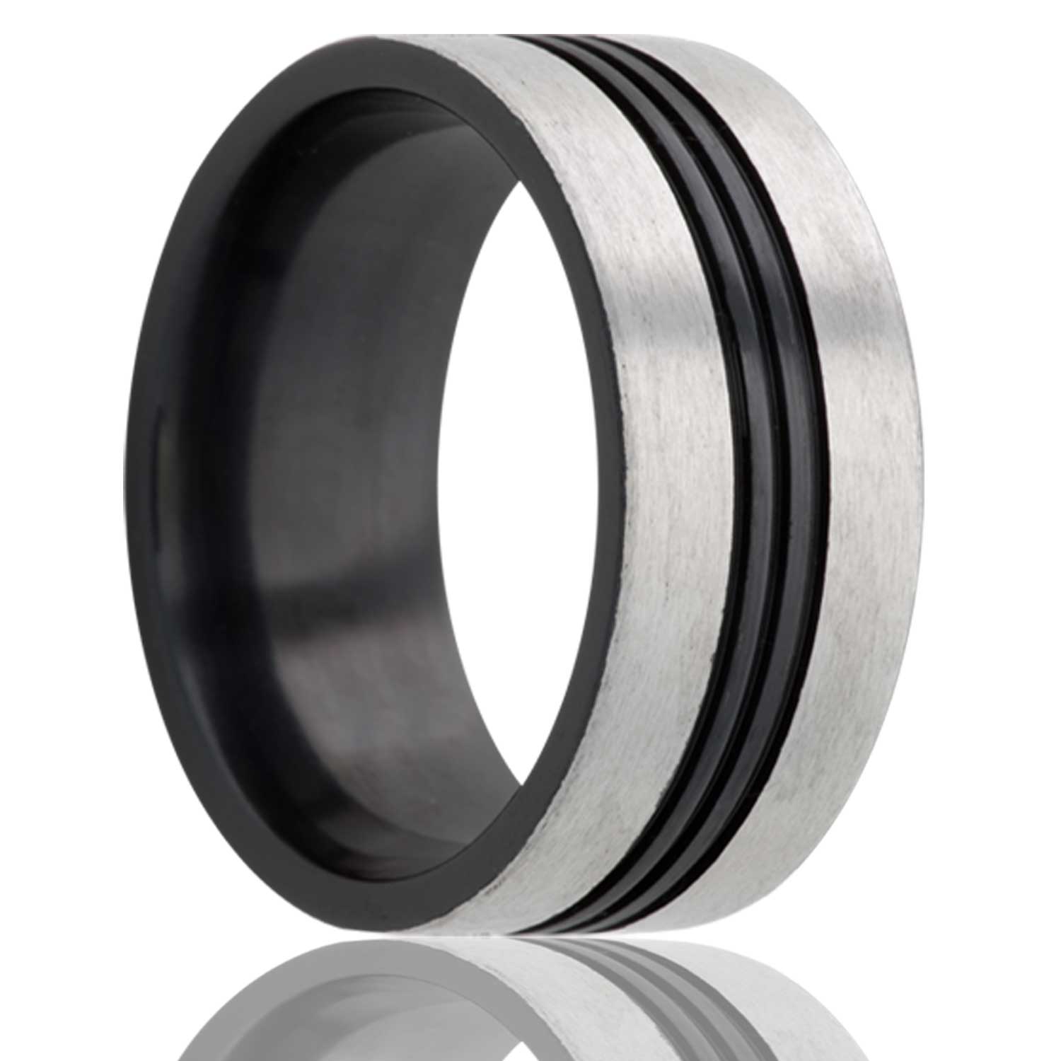 Flat Zirconium ring with three grooves black with satin finish edges. Select width and size then add to cart.