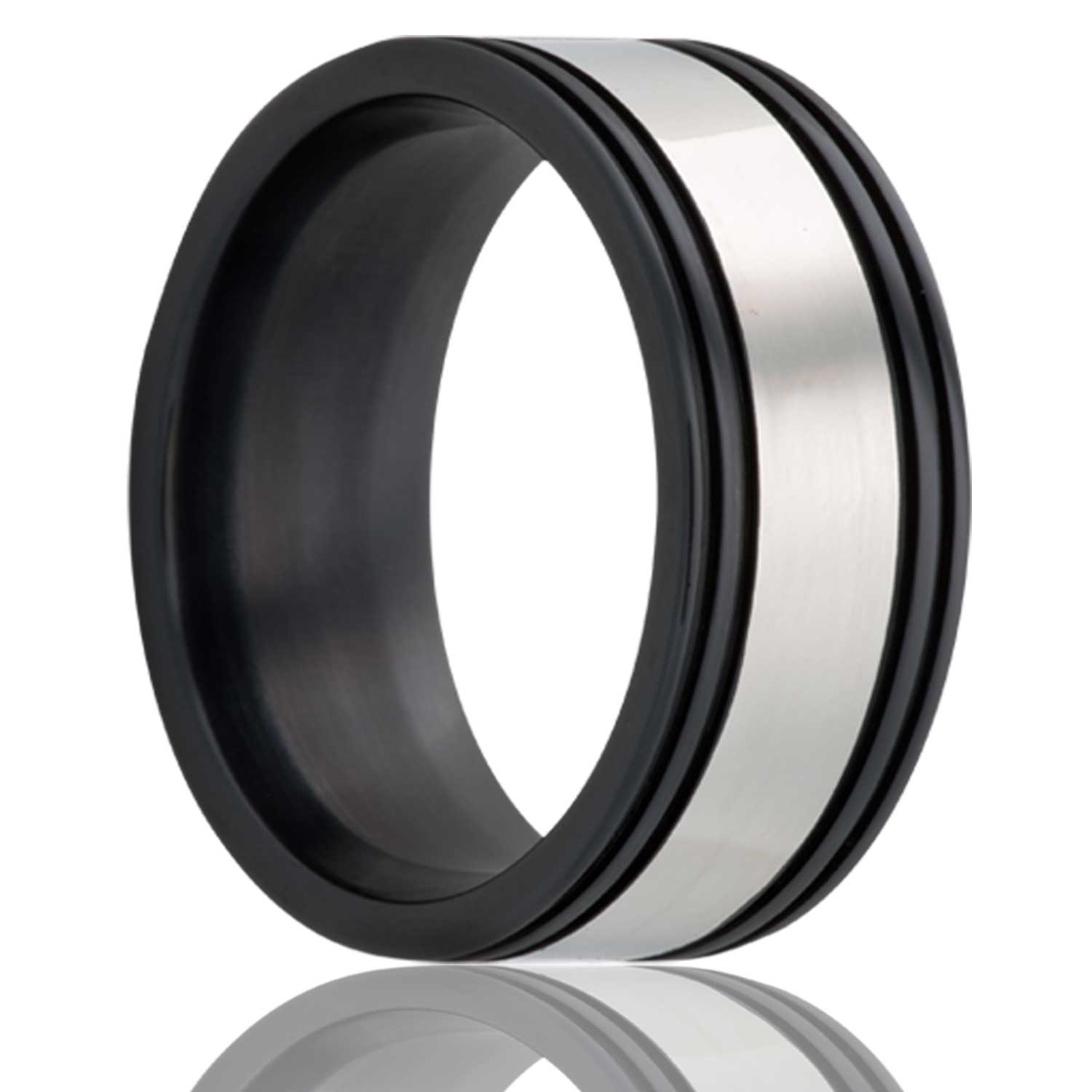 Flat Zirconium ring with four grooves black with a polished center. Select width and size then add to cart.