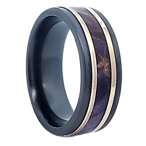 Zirconium Flat Polish w/ Three Piece Center Inlay – 1MM 14K Yellow Gold, 3MM Purple Burl Wood, & 1MM 14K Yellow Gold. Select width and size then add to cart.