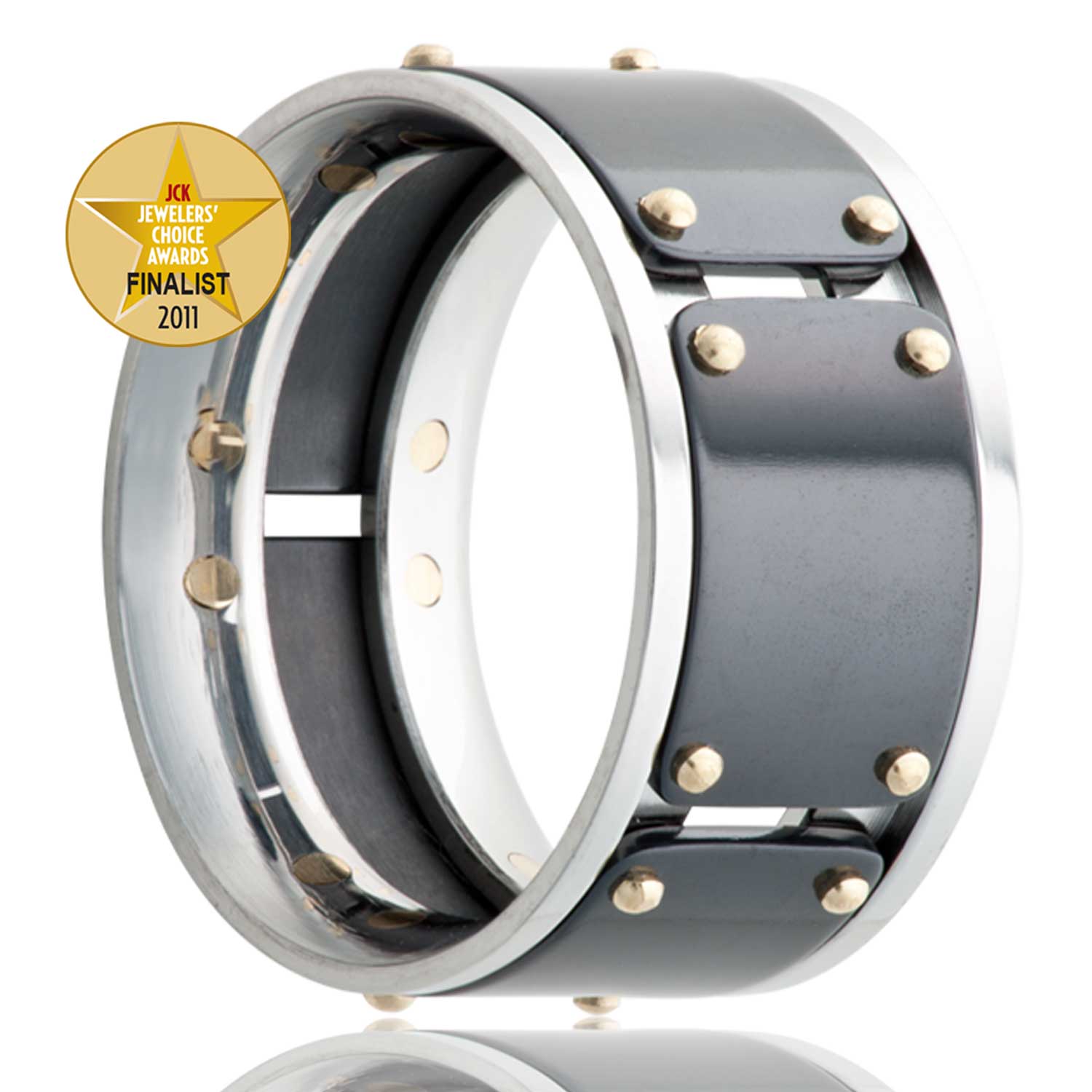 2011 JCK Jewelers Choice Finalist. Cobalt held together with multiple 14k yellow gold rivets and Zirconium plates. Select width and size then add to cart.